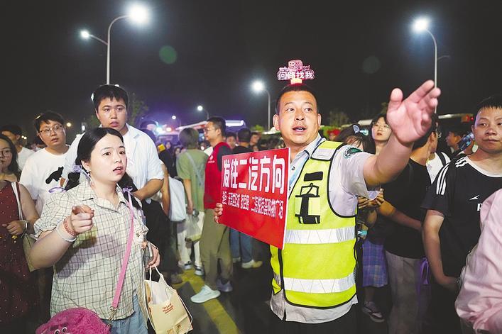 5月18日夜晚,演唱会结束后,襄阳公交集团工作人员指引观众有序乘车。 (湖北日报全媒记者 汪璐 通讯员 余昆 摄)