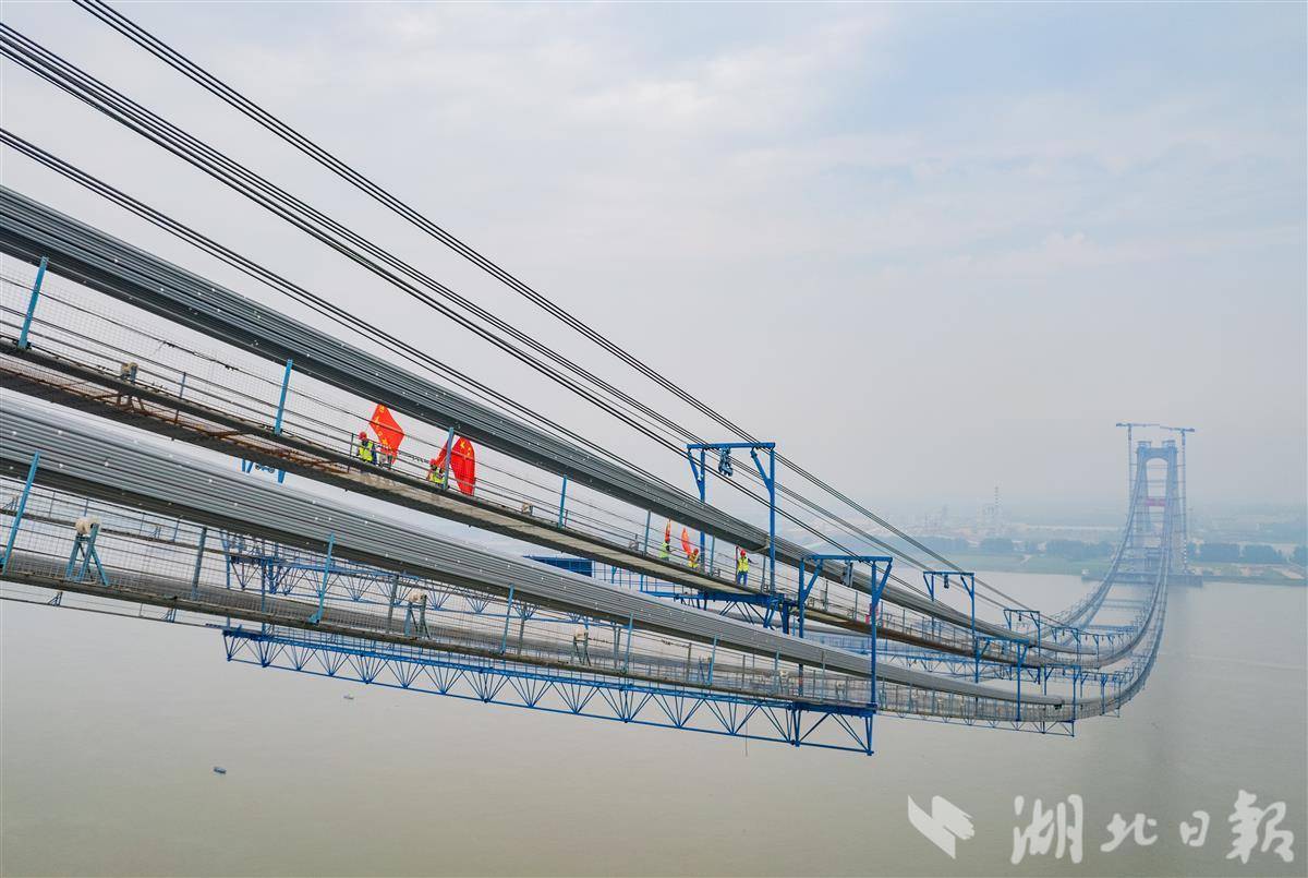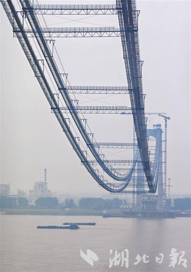 5月26日,燕矶长江大桥主缆架设完成。(湖北日报全媒记者 柯皓 通讯员 吴迪 卢全均 摄)