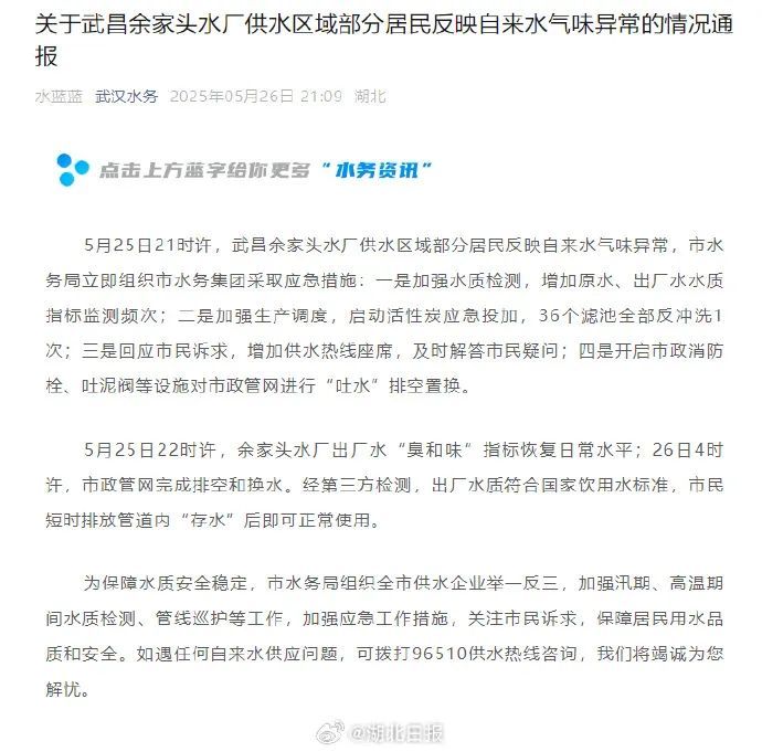 5月26日晚,武汉市水务局发布《关于武昌余家头水厂供水区域部分居民反映自来水气味异常的情况通报》,具体内容如下: