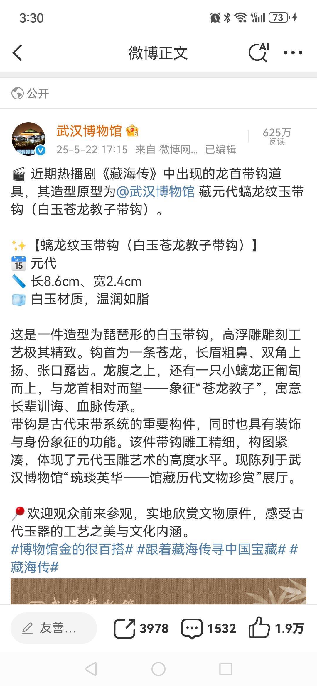 武汉博物馆发布“近期热播剧《藏海传》中出现的龙首带钩道具,其造型原型为武汉博物馆藏元代螭龙纹玉带钩(白玉苍龙教子带钩)”,在微博上获得625万次阅读及大量的转评赞。
