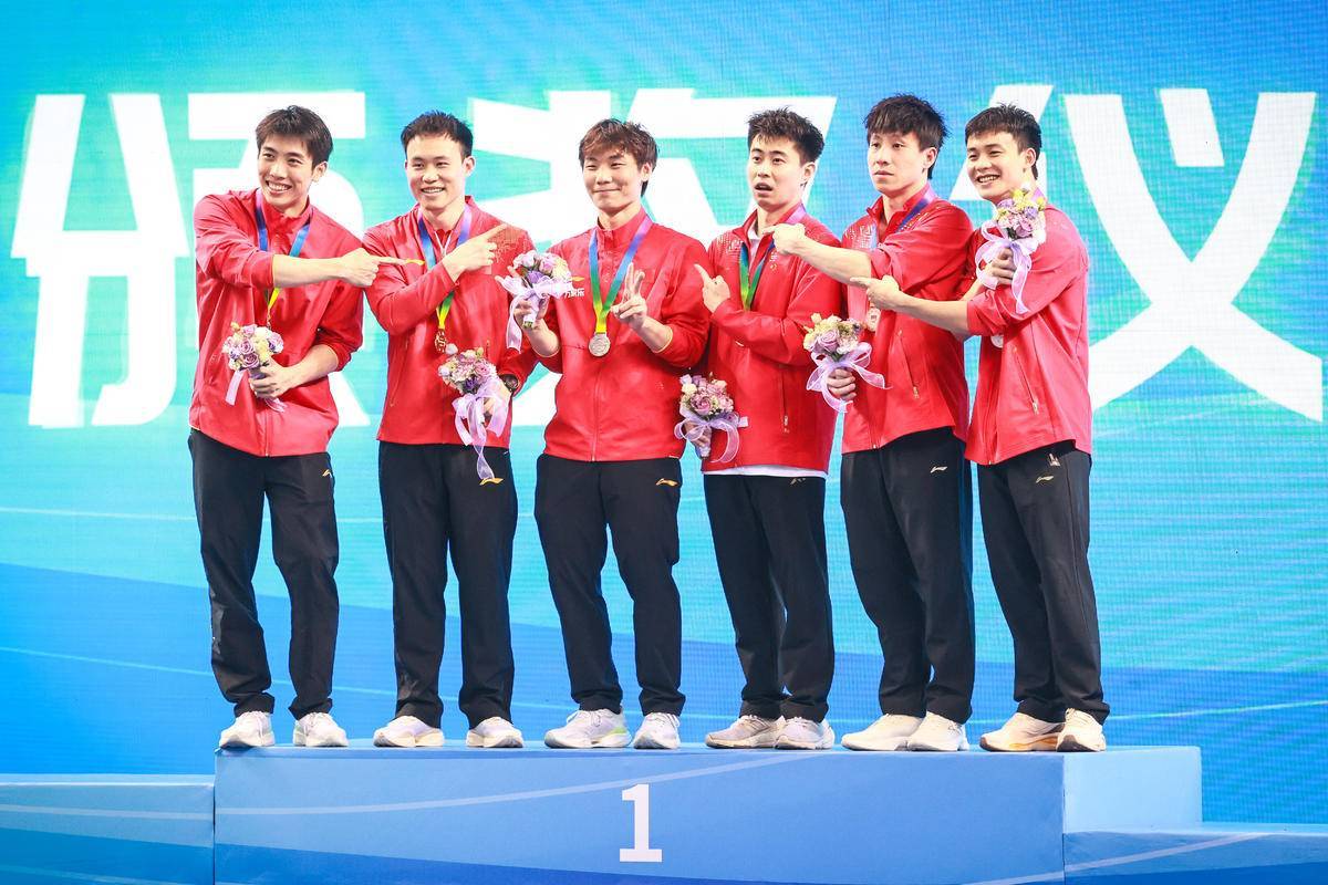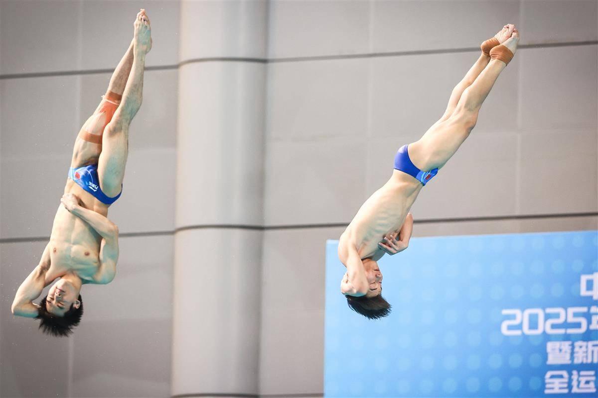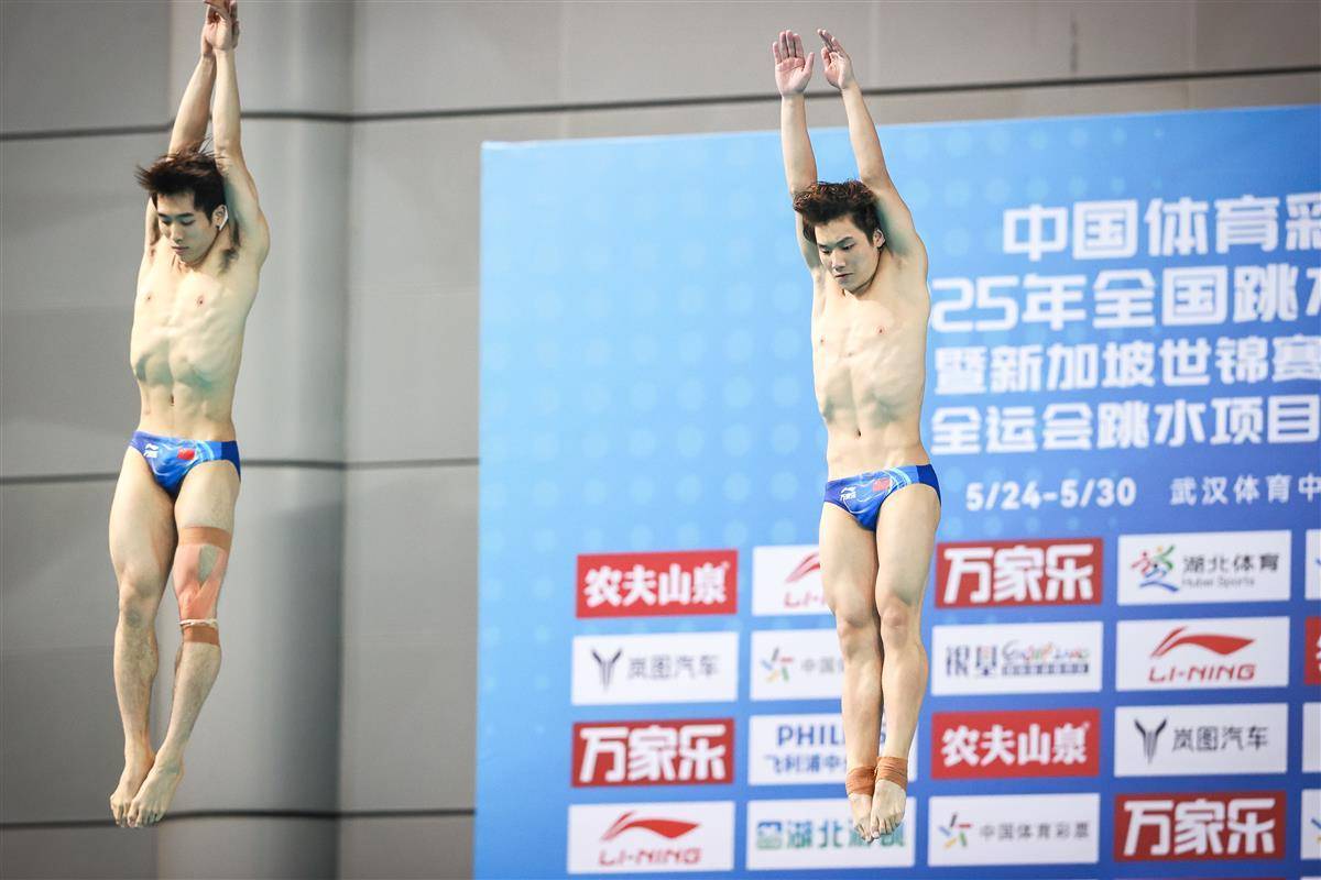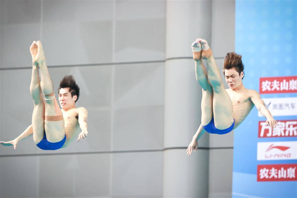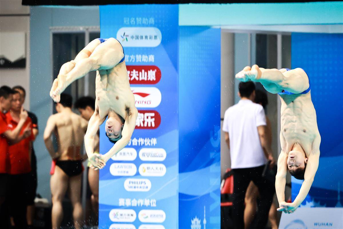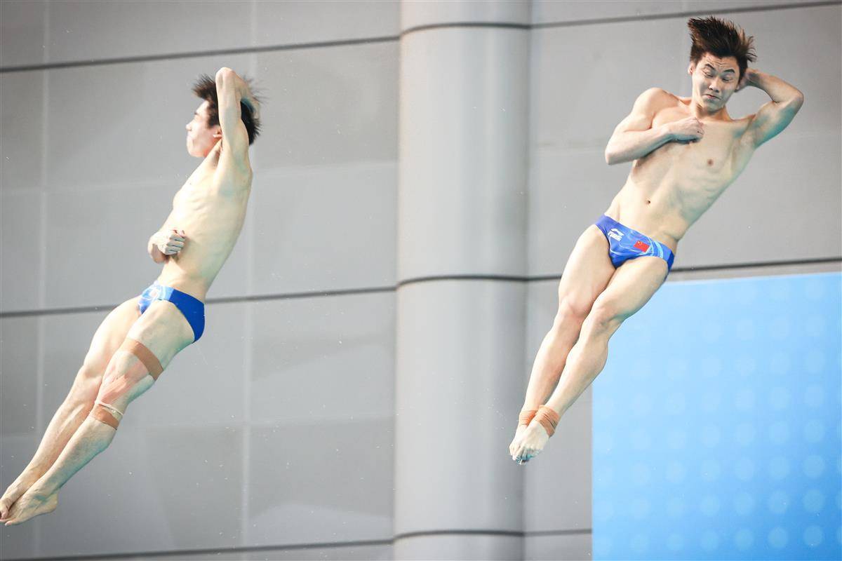 5月27日,武汉体育中心游泳馆,全国游泳冠军赛男子双人三米板决赛,世界冠军、湖北选手郑九源(右)搭档国家队队友、广东队选手胡宇康以437.46分摘银,广东组合谢思埸/黄博文453.12分夺冠。(湖北日报全媒记者 时龚 摄)