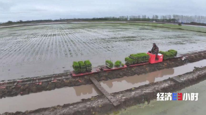 当地还把总长90米的新型运秧航车开到了田间地头。这个集喷灌功能于一体的大家伙,能够实现对40亩秧田的全覆盖,自带传送带运输系统,在保证秧苗及时供应的同时,也节省了大量时间和人力成本。