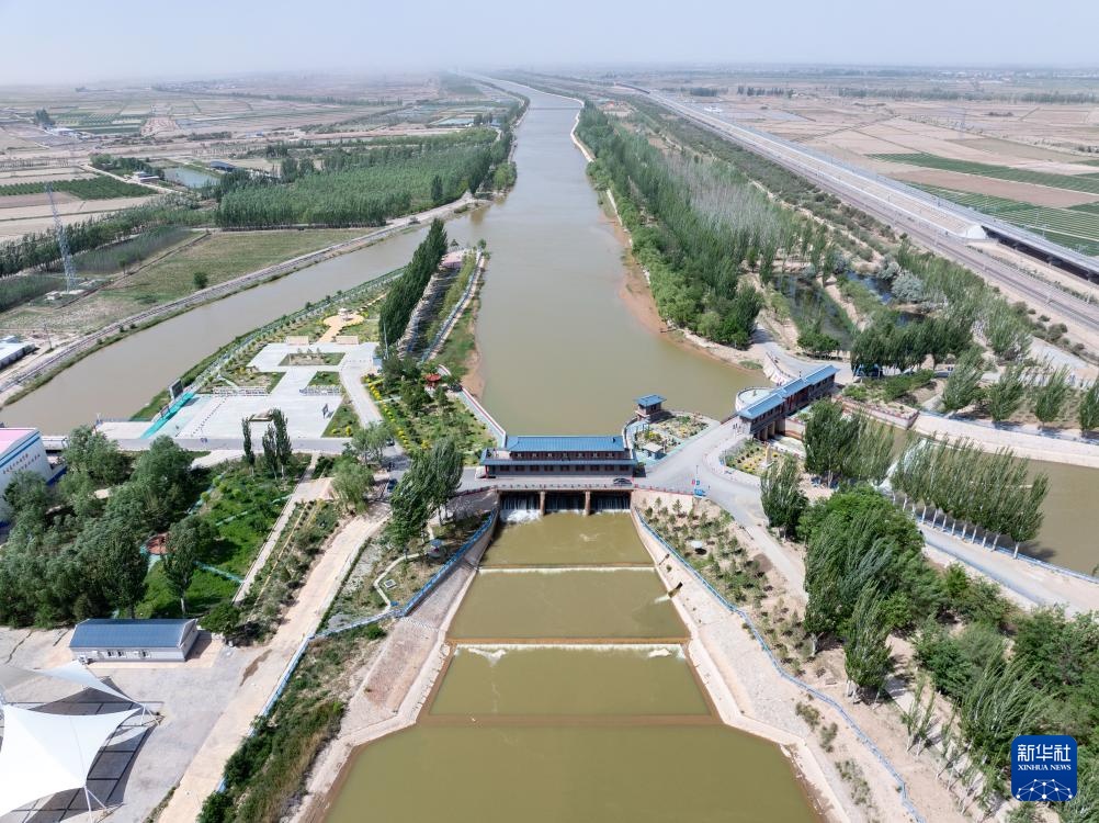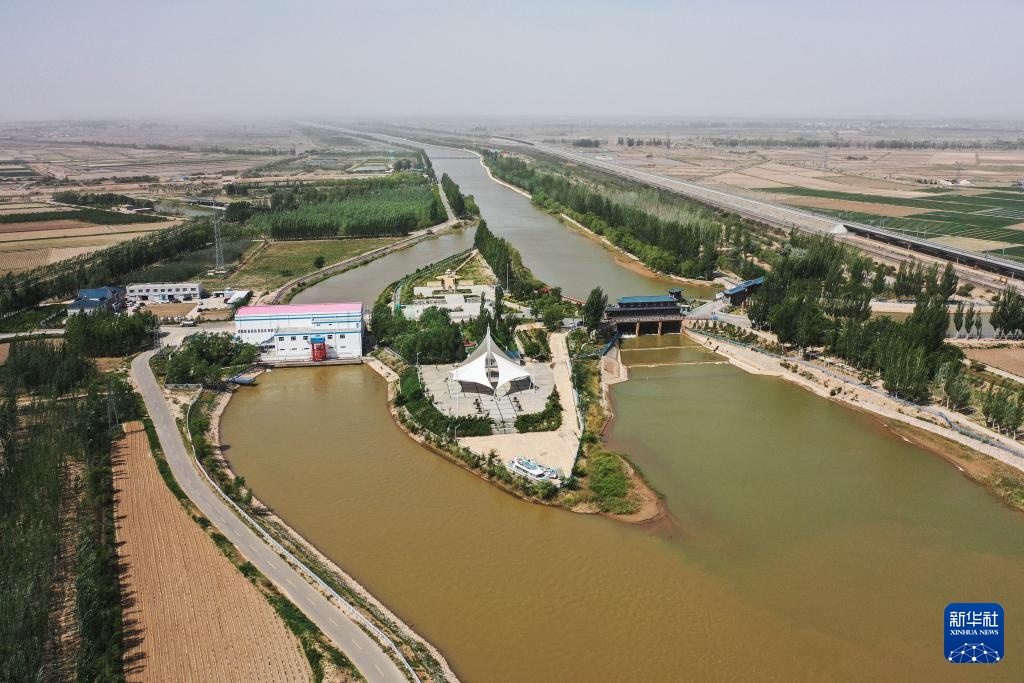 这是5月28日拍摄的内蒙古巴彦淖尔市临河区境内的总干渠第二分水枢纽(无人机照片)。