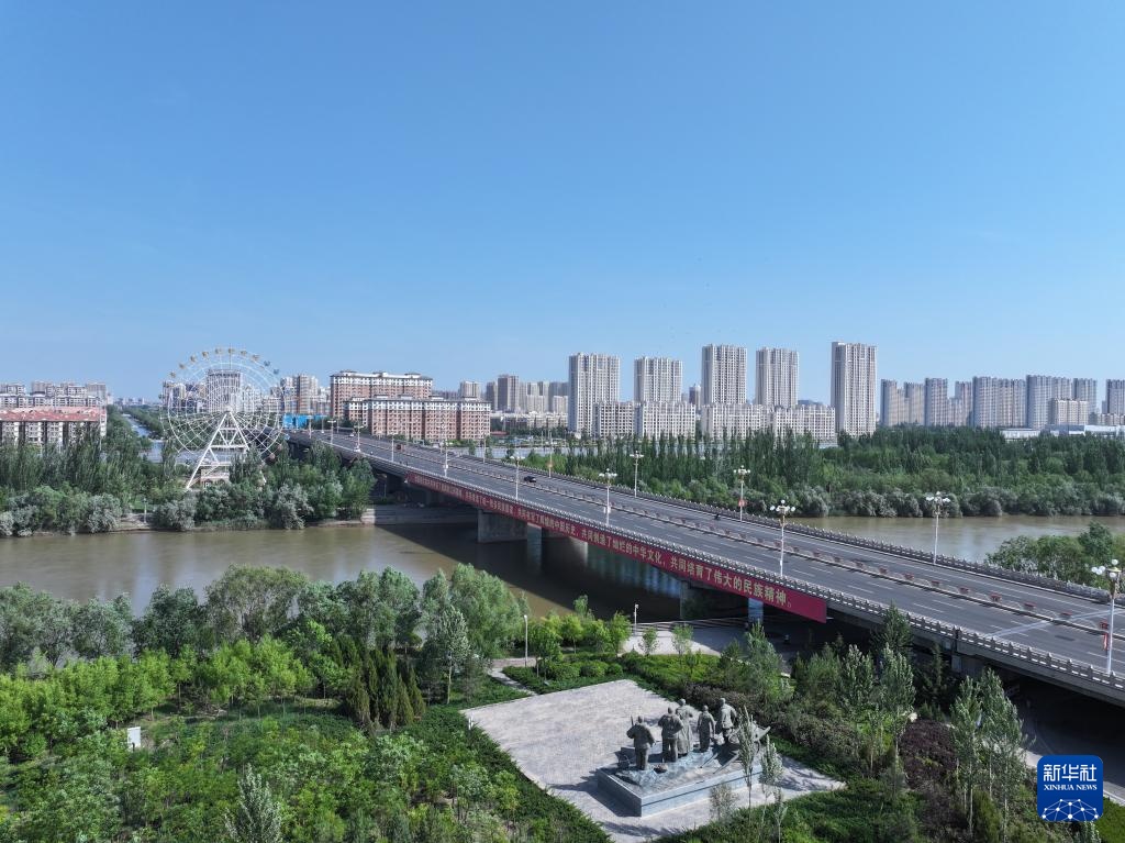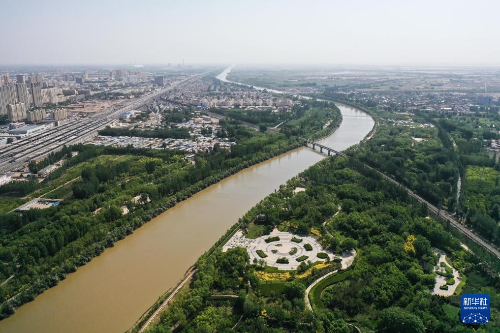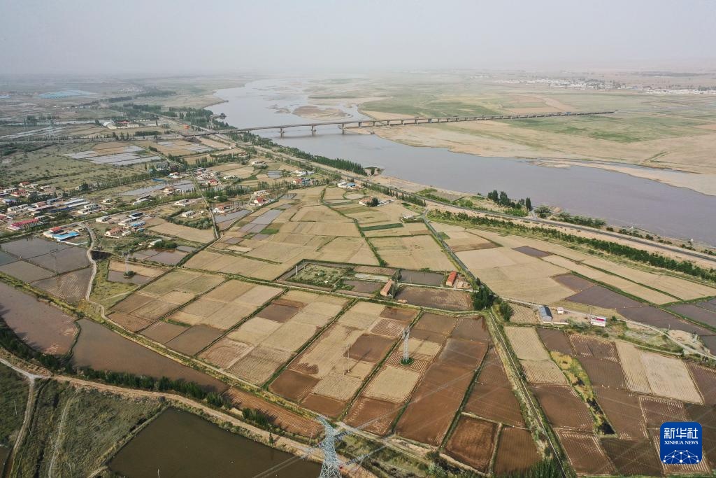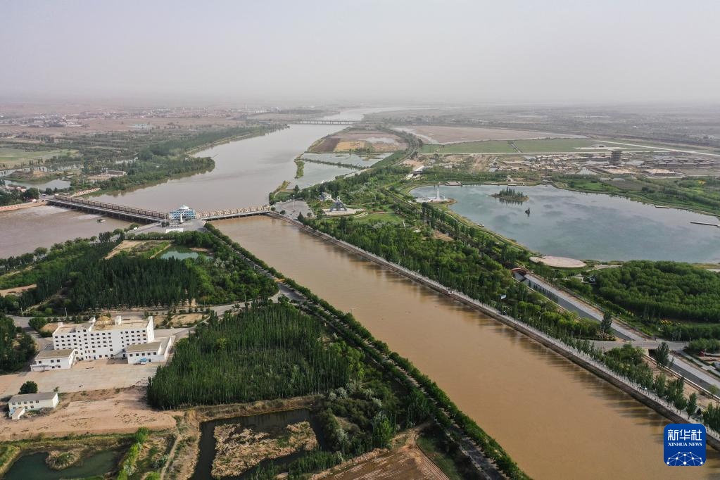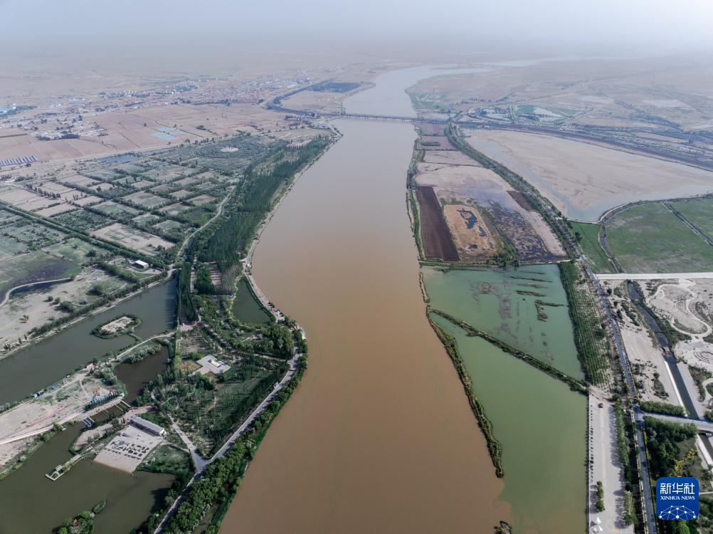 这是5月28日拍摄的位于内蒙古巴彦淖尔市磴口县的黄河内蒙古巴彦淖尔段(无人机照片)。
