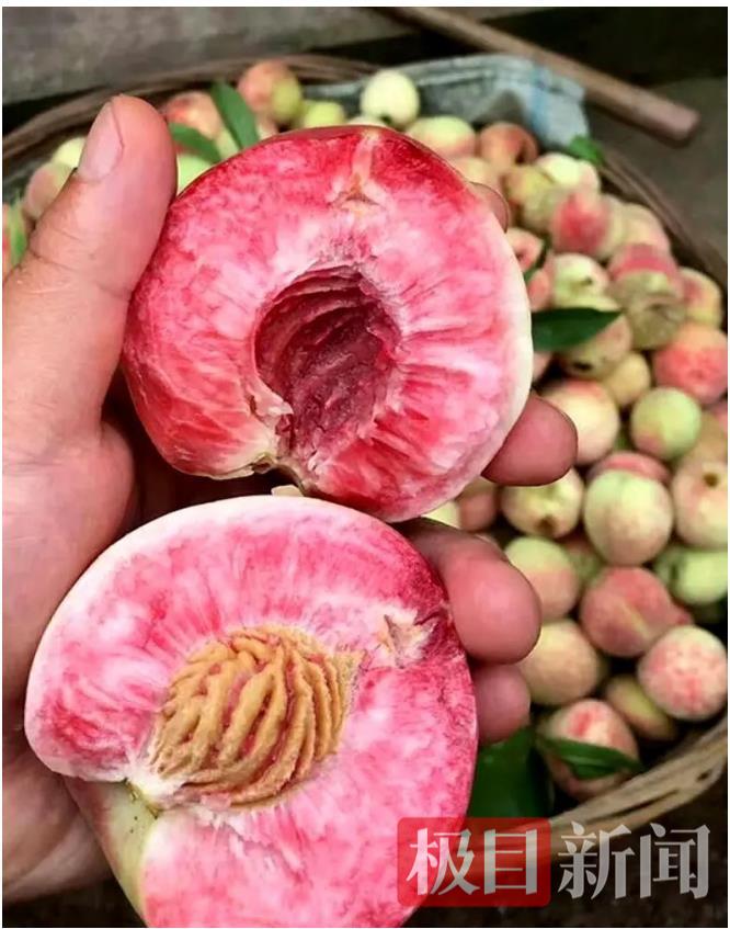 果农介绍,胭脂红鲜桃成熟后果皮红绿纹交织如“花脸”,果肉紫红多汁,肉核自然分离,因食用后唇染胭脂色而得名。