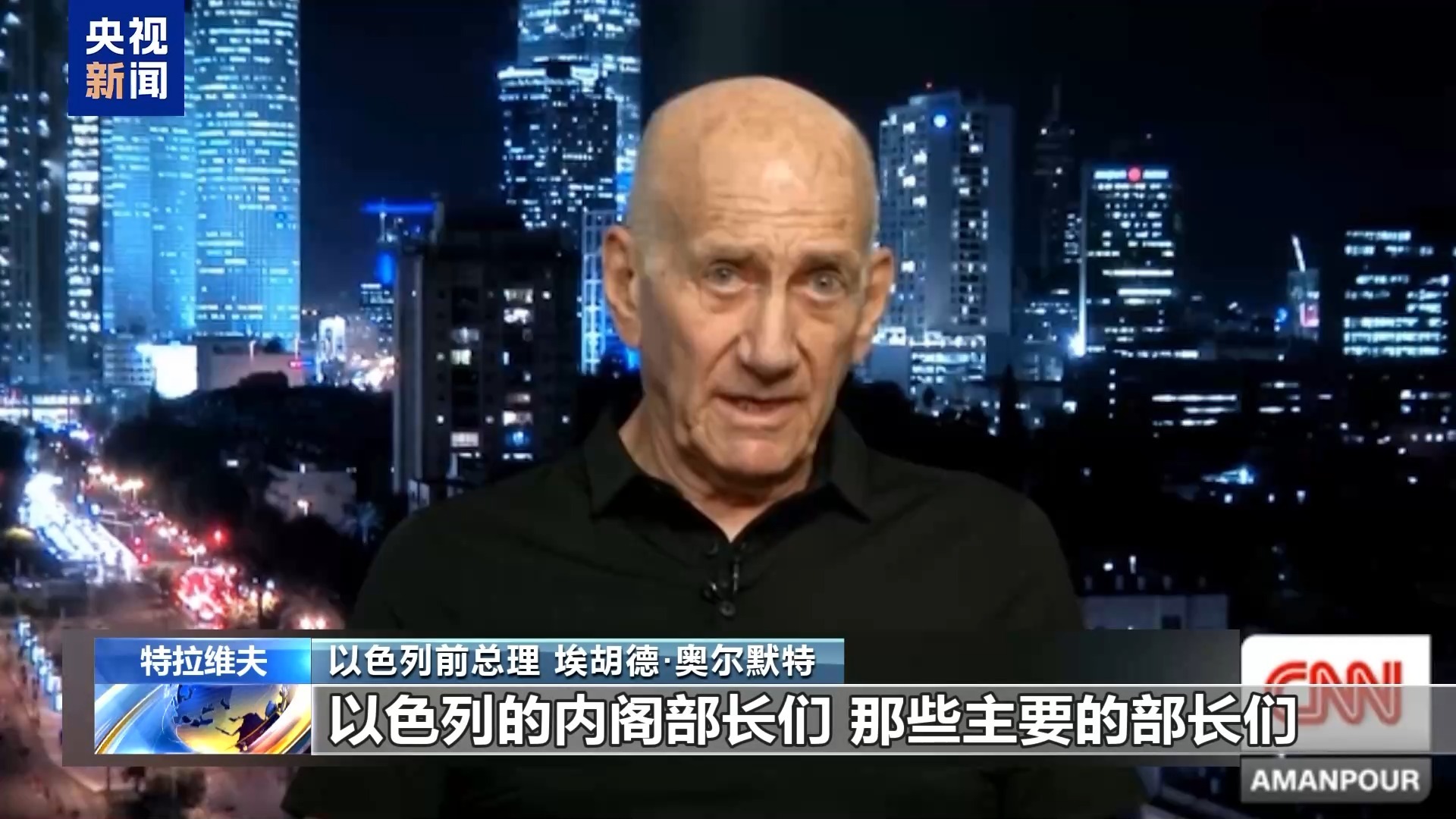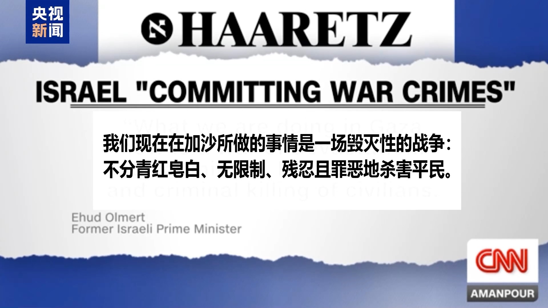 以色列前总理 埃胡德·奥尔默特:我们认为应该结束战争,释放被扣押人员。我认为,我们必须确保加沙的无辜平民,不会因军事行动的扩大而受到伤害,这种扩大是完全没有正当理由的。