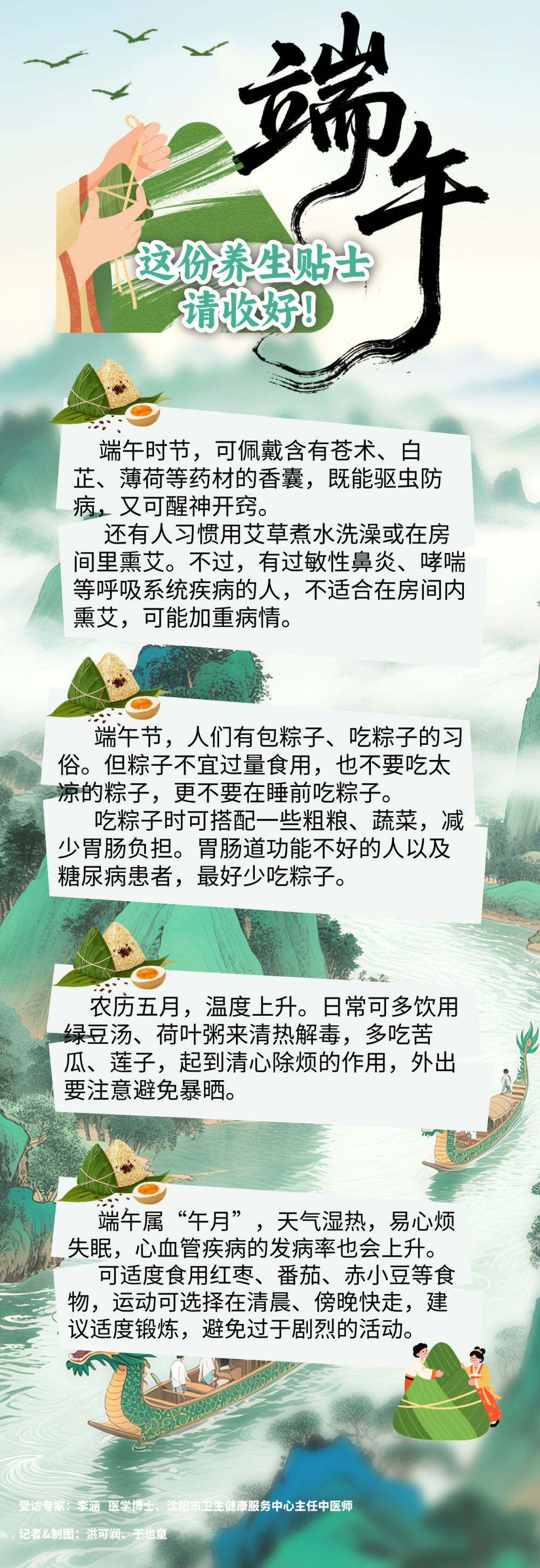 新华社沈阳5月30日电(记者于也童、洪可润)农历五月五,端午佳节至。端午节可以说是古代的“卫生节”,是古人在仲夏时节调理养生的关键节点。端午时节湿热交织,蚊蝇害虫及细菌活动频繁,百病易从口鼻而入。一草一木皆药方,一饮一食有讲究……看图,收下这份“端午安康”小贴士。