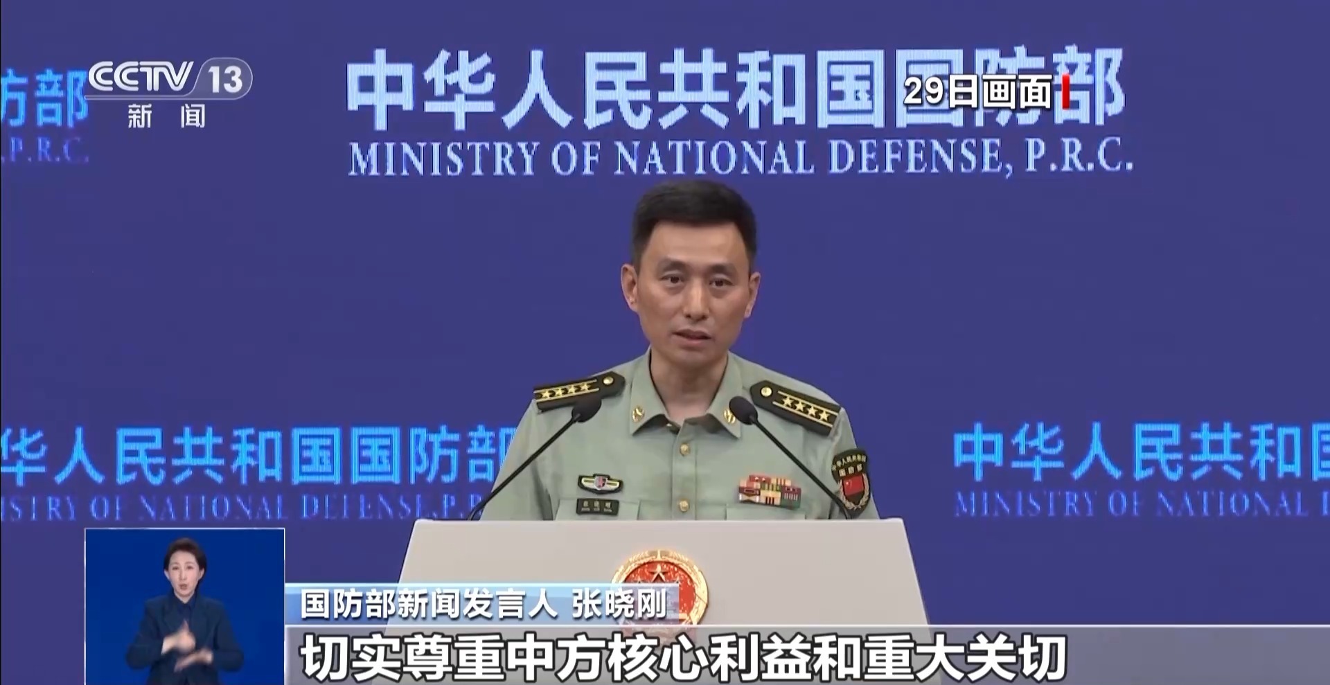 国防部新闻发言人 张晓刚:中方重视中美两军关系,对双方各层级沟通持开放态度。希望美方切实尊重中方核心利益和重大关切,与中方相向而行,推动两军关系健康稳定发展。