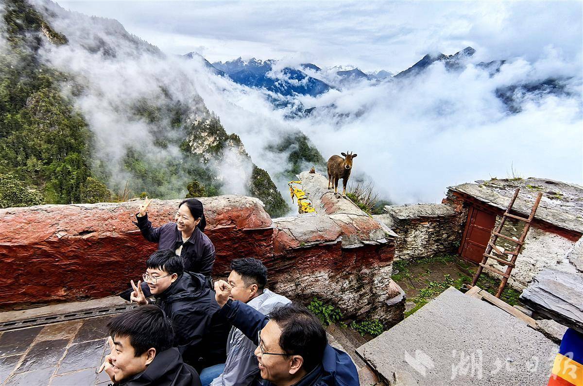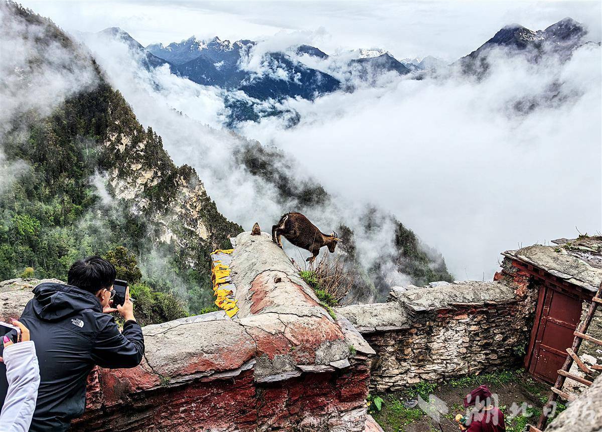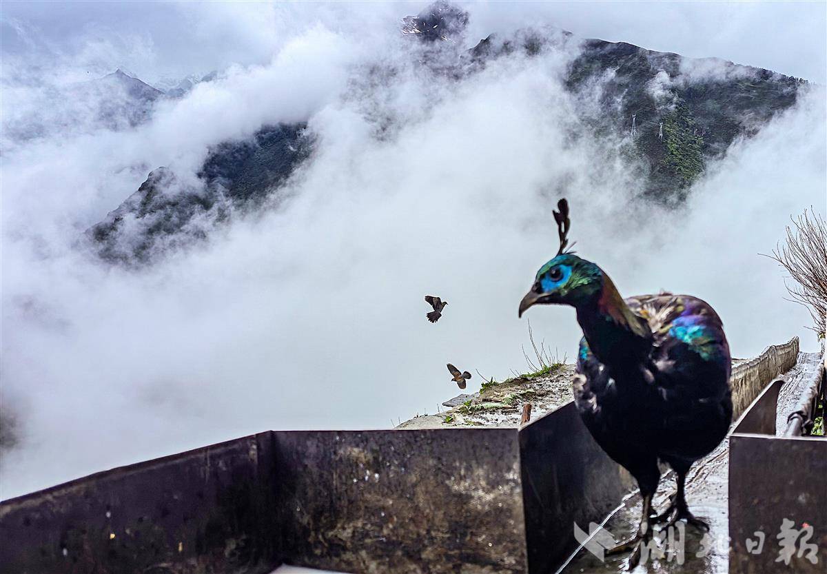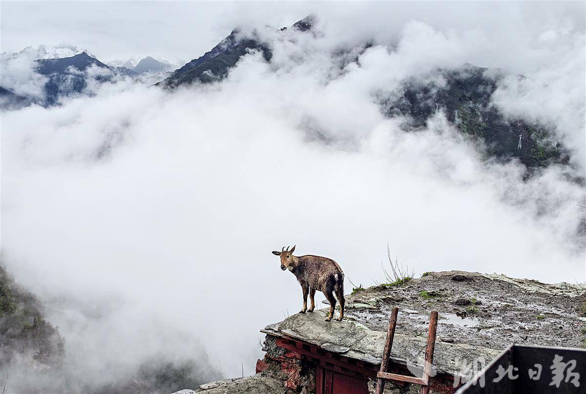 这座寺庙常年被云雾笼罩,仿佛置身于云端之中。寺院的僧人每天都在平台上投放一些米、饼等食物,棕尾虹雉、喜马拉雅斑羚、星鸦、松鼠、鼠兔和亚洲熊等如约而至,这里已成为珍稀动物的天堂。(湖北日报全媒记者 朱熙勇 摄)