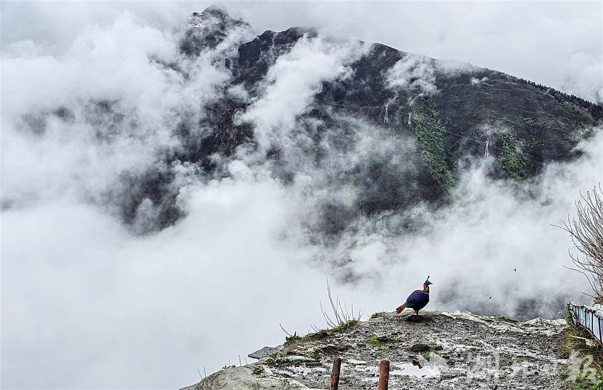 5月30日,西藏卡久寺笼罩在云雾中,一只国家一级保护动物——棕尾红雉(九色鸟)登上寺庙旁的平台,开始了它的“演出”。