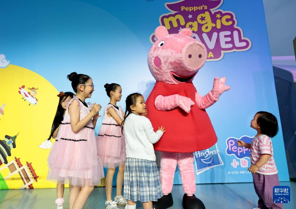 5月31日,工作人员装扮的佩奇玩偶与小朋友们互动。