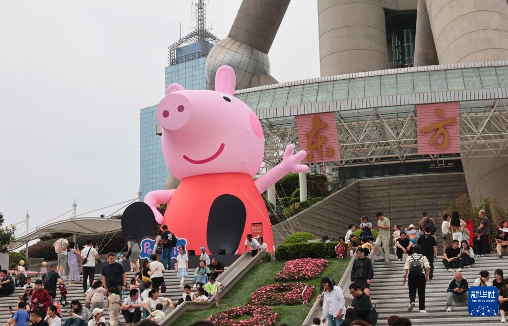 5月31日,游客在东方明珠广播电视塔下的佩奇玩偶旁游玩。