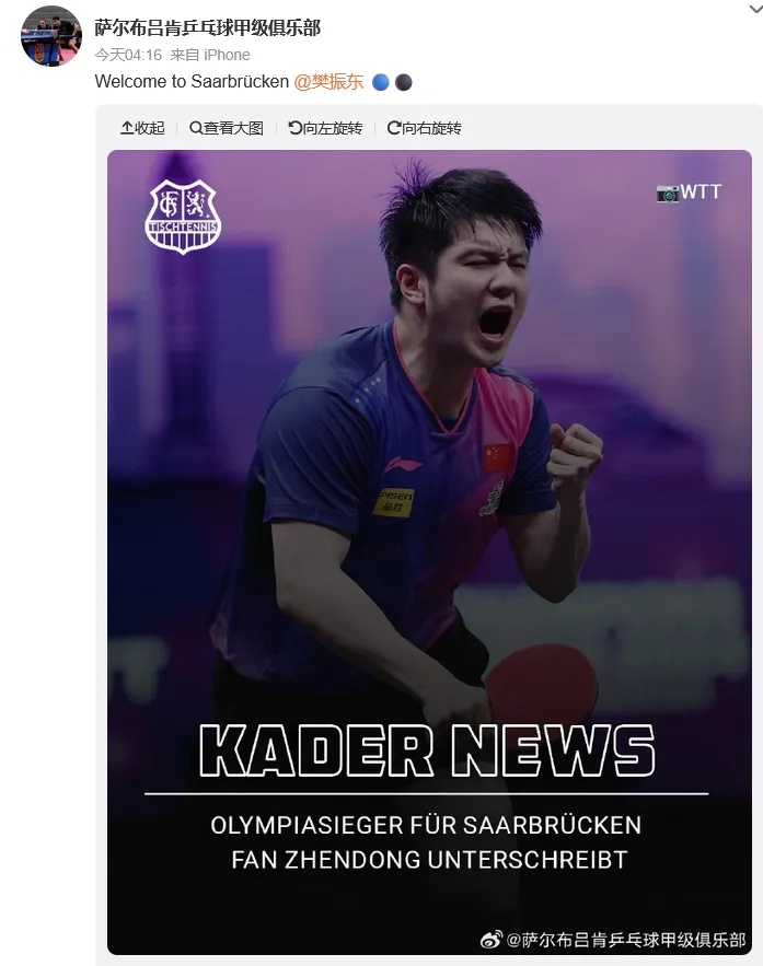 值得一提的是,早在2019年,萨尔布吕肯便邀请中国球员尚坤加盟球队,后者正是樊振东上海队的队友。同时,上赛季也有国乒队员前往德甲参赛,彼时林高远便代表德甲豪门穆尔豪斯俱乐部征战2024-2025赛季乒乓球欧冠联赛。
