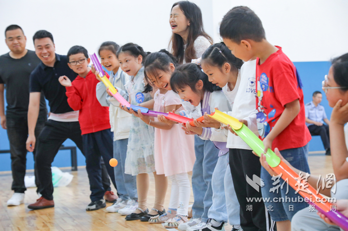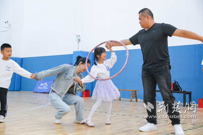 欢乐的氛围持续升温,亲子互动游戏轮番上阵。在“一圈到底”游戏中,家长和孩子们手拉手排成一列,默契配合,用灵活的肢体动作让呼啦圈在队伍中穿梭传递。