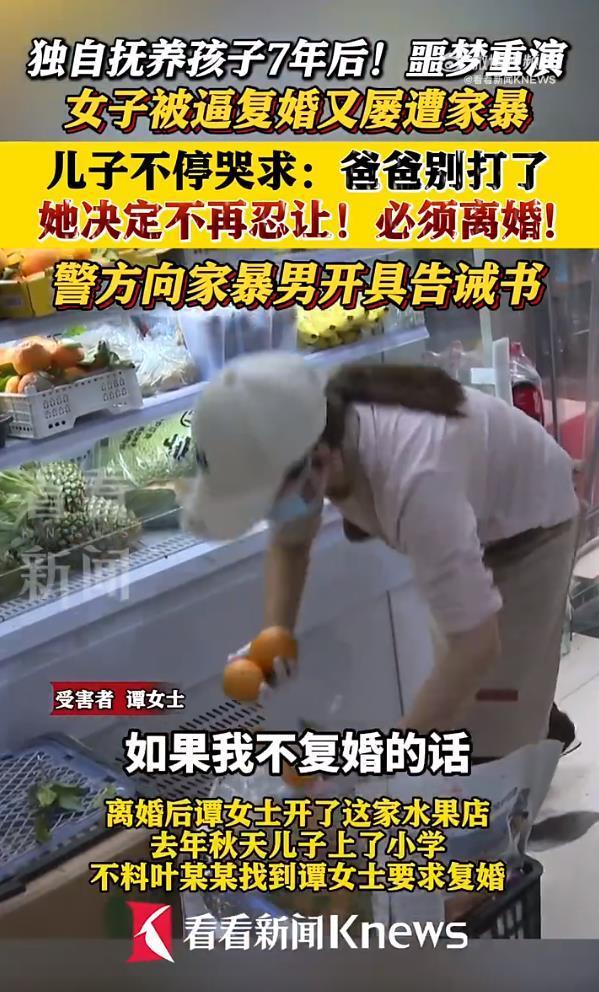 重庆谭女士在自家水果店遭丈夫叶某某家暴致伤。监控显示,5月31日下午,叶某某在7岁儿子哭求下仍多次将她打倒在地,谭女士奋起反抗扭打。谭女士称,两人2017年闪婚后她屡遭殴打,2018年离婚后独自抚养儿子。去年儿子入学,叶某某以“去学校闹”胁迫谭女士于今年2月复婚。复婚后叶某某索要生活费,此次施暴因谭女士未经其同意带孩子回娘家住了一晚。谭女士就医后被诊断为“闭合性颅脑损伤轻型,全身多处软组织损伤”。律师指认男方为施暴方。6月1日,警方对叶某某开具《家庭暴力告诫书》,责令其停止家暴并展开调查,同时告知谭女士可申请保护令。谭女士决心再次离婚,表示不再忍耐。(据6月2日看看新闻报道)