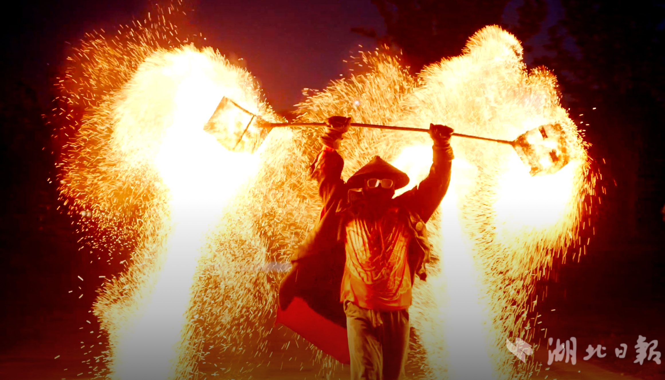 当夕阳沉入湖面,一场视觉与文化的盛宴悄然启幕——川剧变脸的神秘面具在火光中翻飞,绚烂的打铁花点亮夜空,500架无人机腾空而起,以3D编队为笔,在夜空中作画。