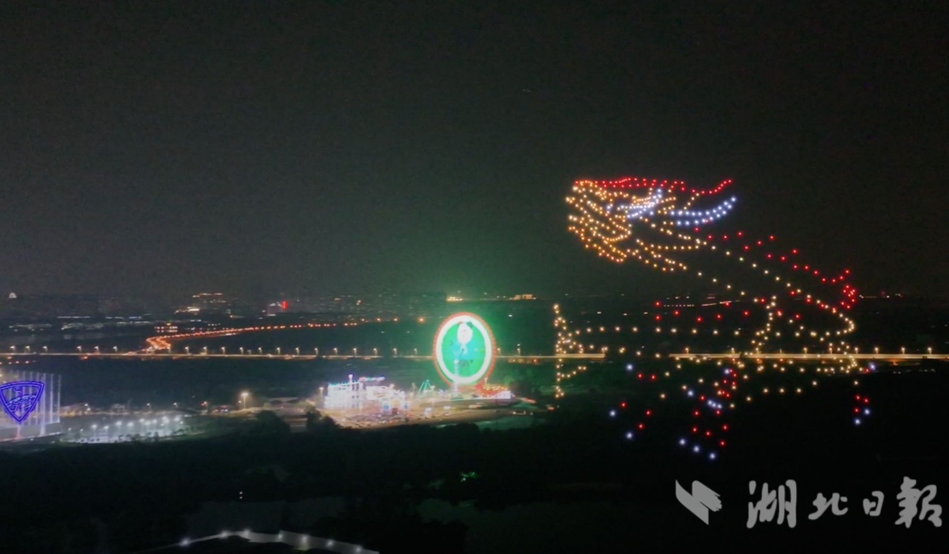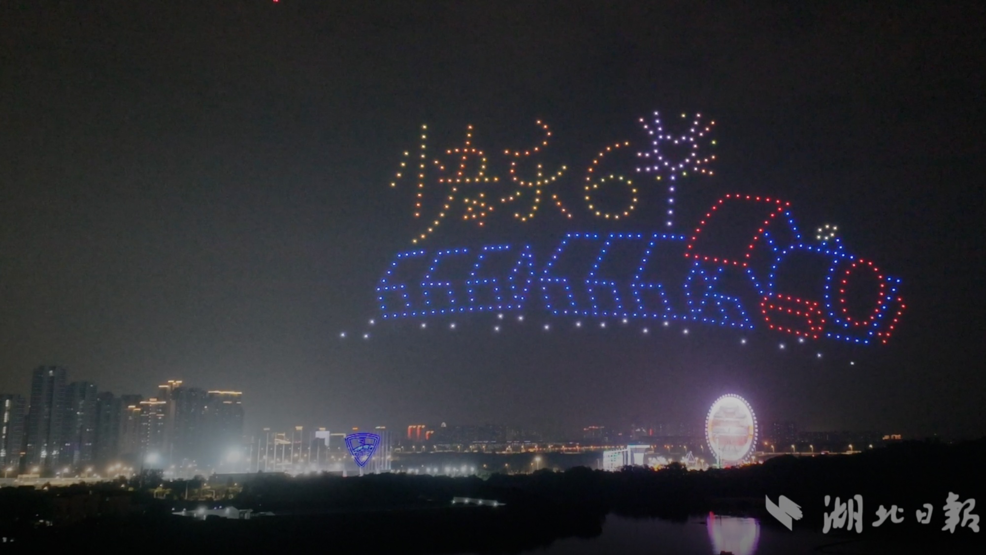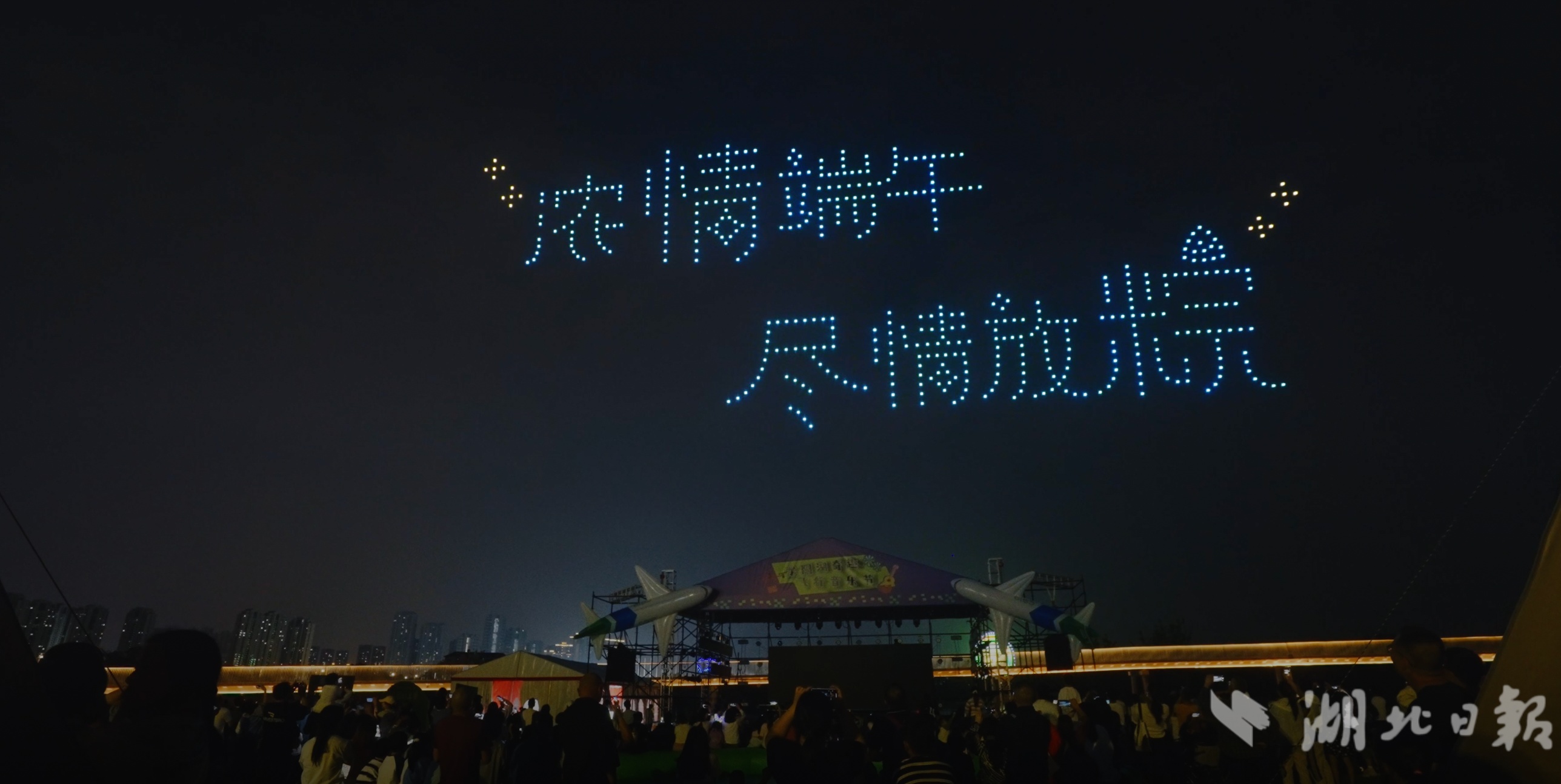 湖北日报讯(记者朱惠、通讯员谭莹、程思)6月2日,武汉市汉阳区龙阳湖畔,500架无人机腾空而起,在夜空中组合成黄鹤楼、龟山电视塔、归元寺等武汉地标,为今年端午六一双节期间的龙阳湖奇趣飞行音乐节画上完美句号。