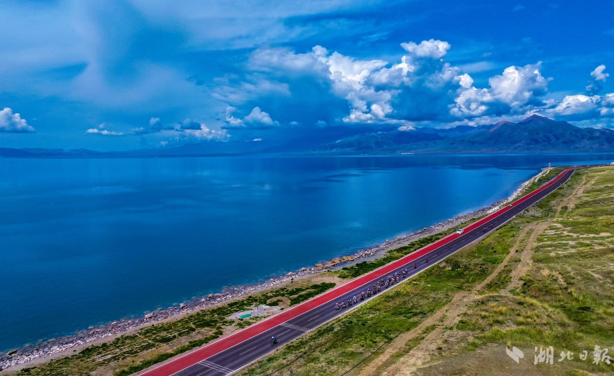 来自世界各地的自行车运动员们骑行在美丽的赛里木湖边。(湖北日报全媒记者 何宇欣 摄)