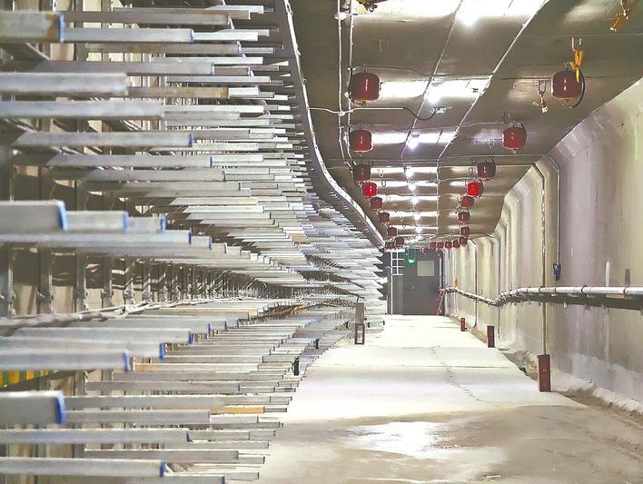综合管廊的墙壁上,几排金属支架一直向前延伸,每一排上都架着不同管线。10kv电力线和通讯管线已经开始运转,墙壁的另一侧,是110kv高压线——为了安全起见,它被安排住进了“独立舱室”。
