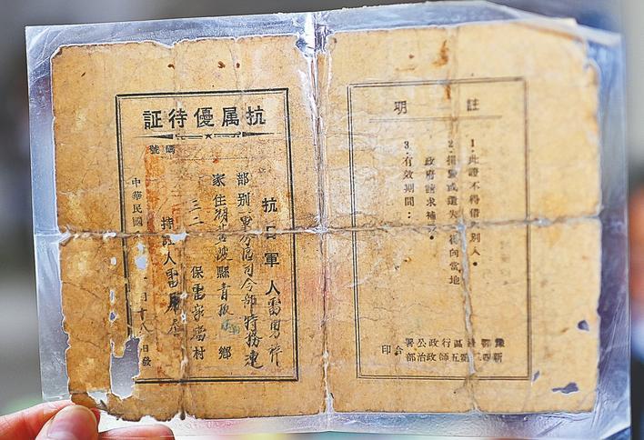 雷用香珍藏着一张《抗属优待证》,这张颁发于上世纪40年代的证件虽已残破泛黄,却是老人抗战生涯的最珍贵纪念。