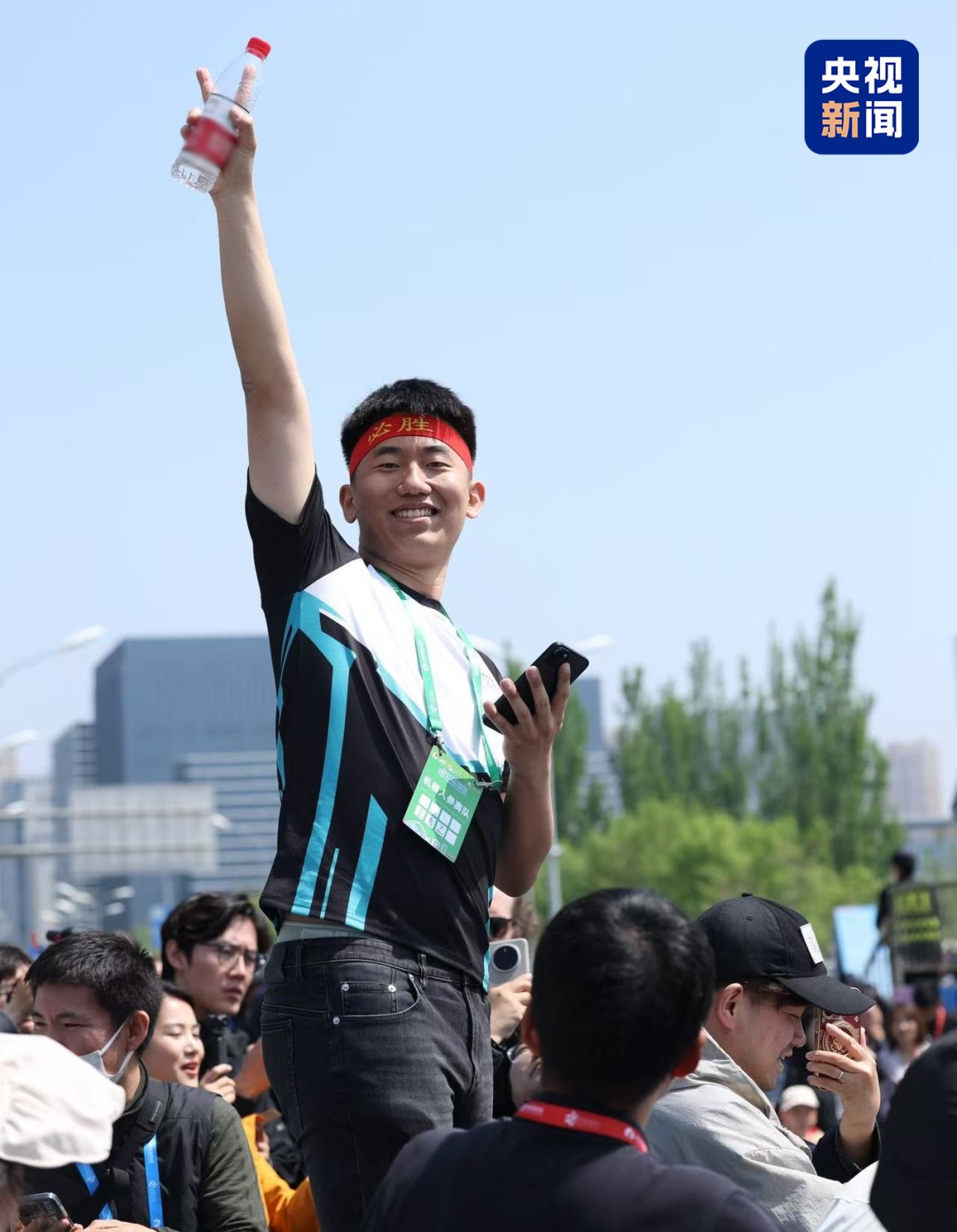 当时,在马拉松的终点区,头戴红色“必胜”发带的姜哲源带领团队激动地为两支队伍加油呐喊,被观众评价“情绪价值拉满”。他甚至还现场“带起了货”,劝说身旁的观众们也买一台玩玩。