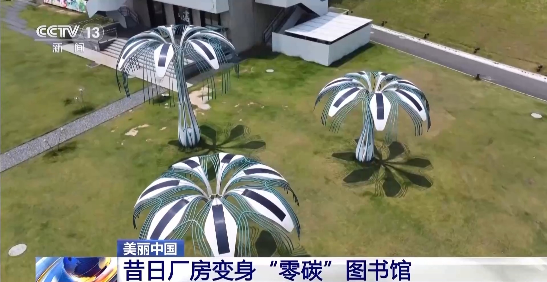总台央视记者 赵晶:昔日关停的化工厂,改造成为村里的“零碳”图书馆,屋顶上安装了光伏玻璃瓦片,草坪上还有3棵“光伏树”。图书馆白天发电,自发自用,多余电量储存。建材方面还使用了当地的毛竹等大量绿色建材,降低能耗。