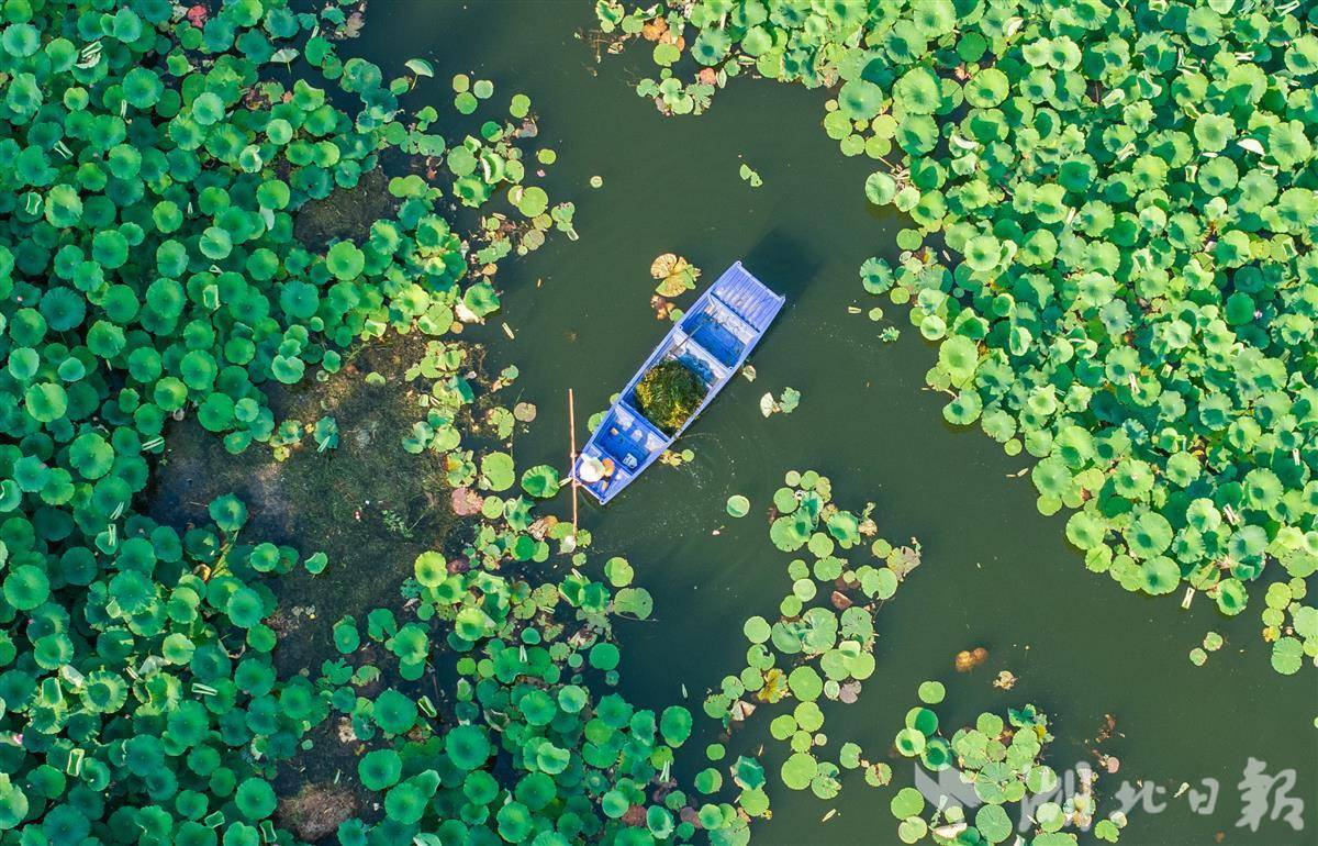 6月5日,武汉东湖国家湿地公园,环卫工人在湖面打捞漂浮物。当日是世界环境日,一群东湖湖面“美容师”顶着烈日打捞水葫芦、浮萍等漂浮物,守护东湖一湖碧波。(湖北日报记者薛婷摄)
