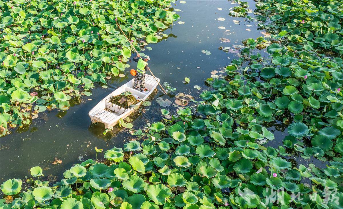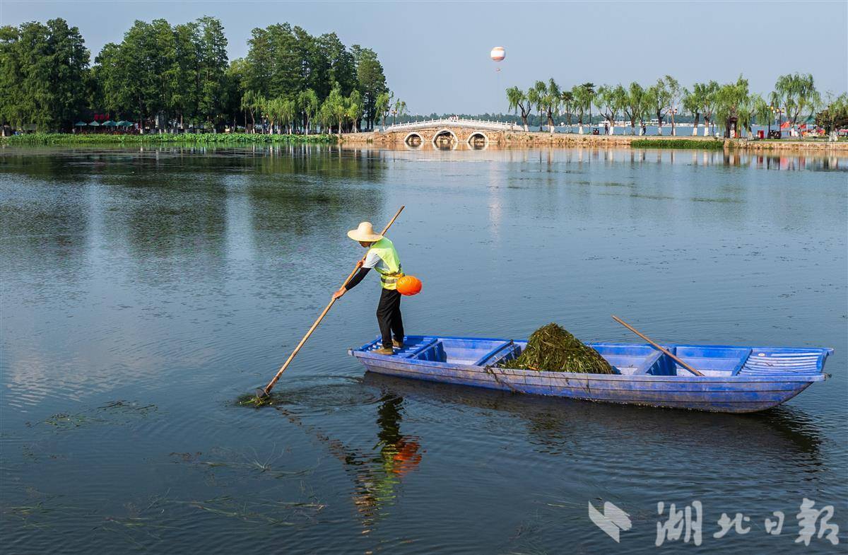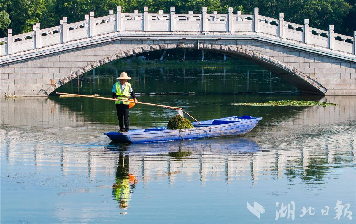 6月5日,武汉东湖国家湿地公园,环卫工人打捞水面漂浮物。
