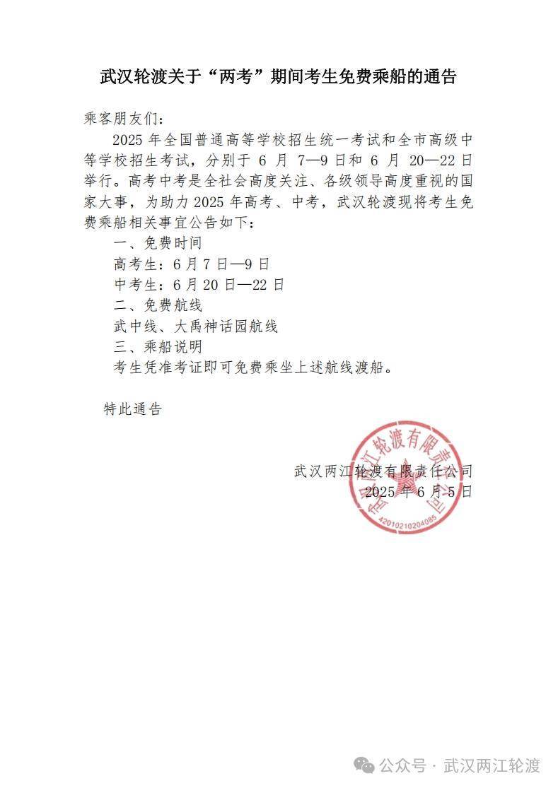 湖北日报讯(记者黄洁如、通讯员邹密)为助力2025年高考、中考,武汉轮渡现将为考生免乘船费。6月7日-9日高考生,6月20日-22日中考生可免费乘坐武中线、大禹神话园航线。考生凭准考证即可免费乘坐上述航线渡船。