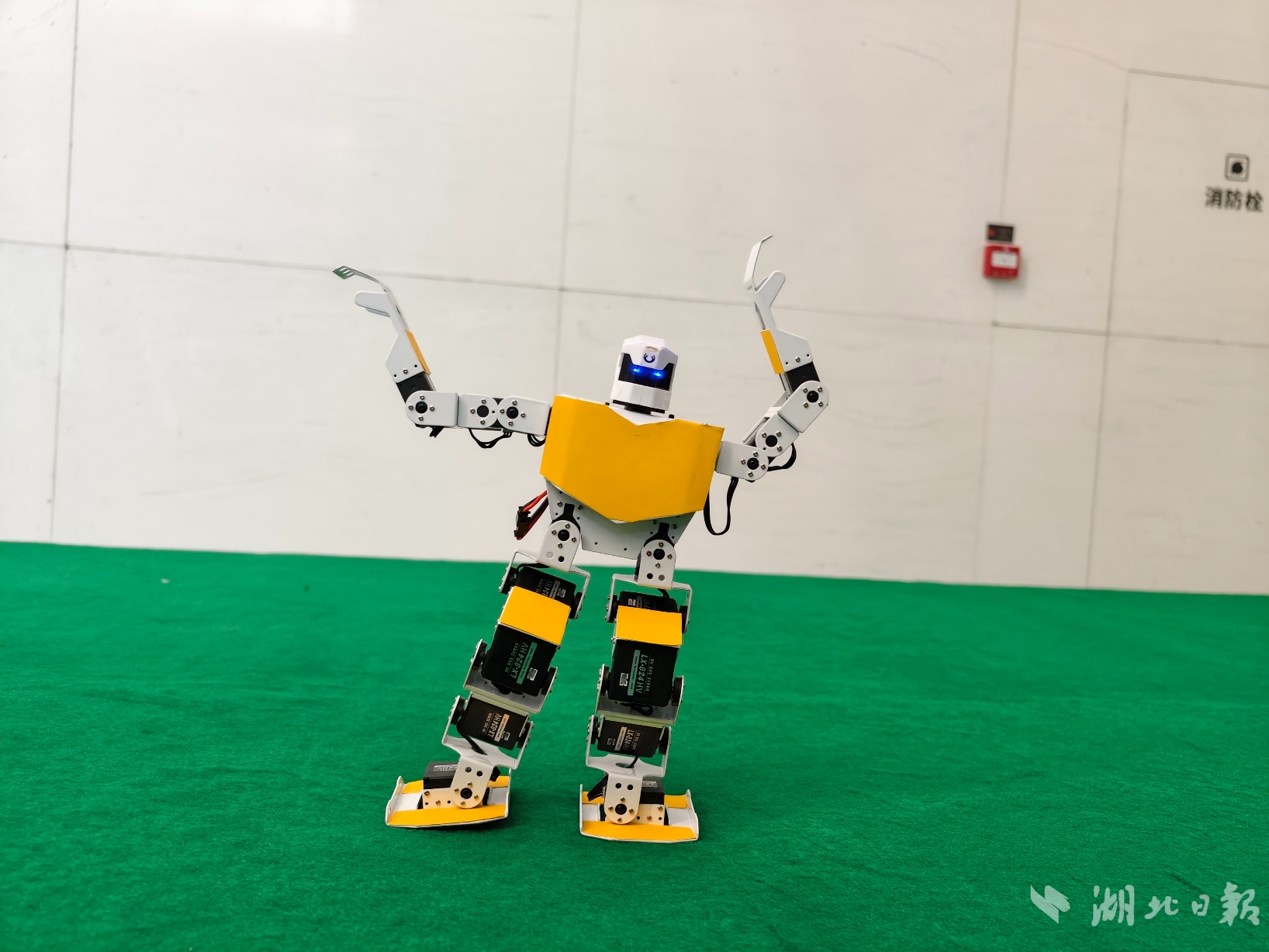 武汉大学的机器人正在参加短跑比赛。