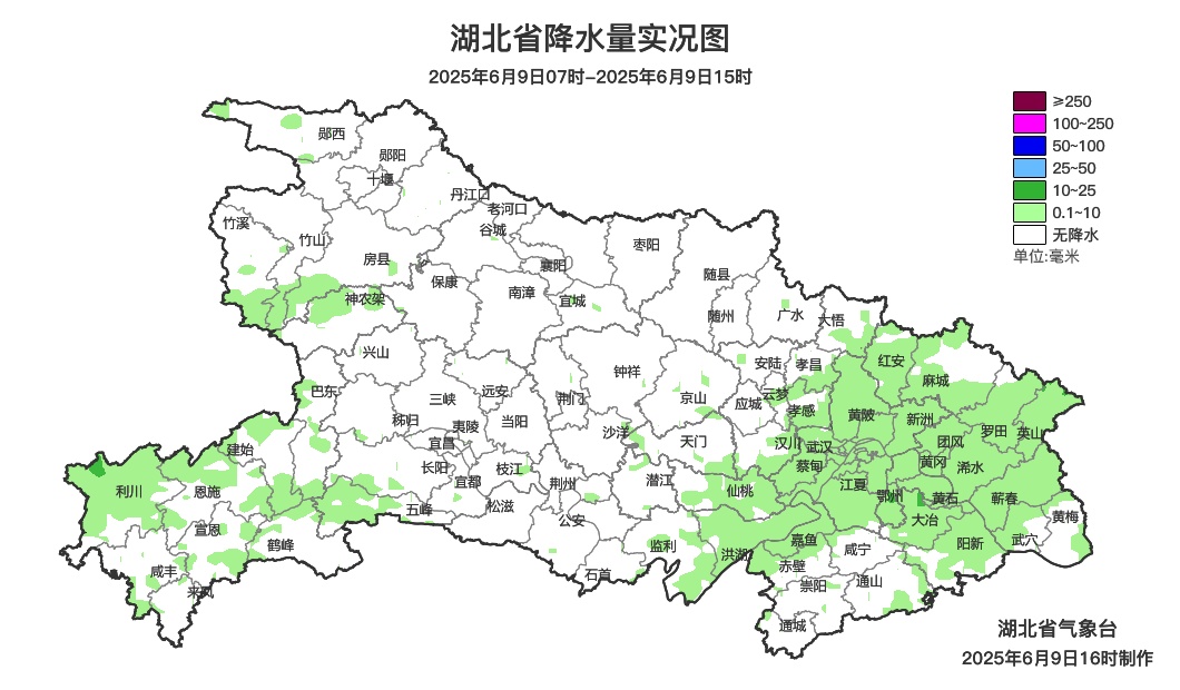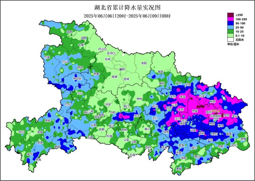 6日晚至8日,鄂西南、江汉平原及以东地区遭遇大范围大雨到暴雨天气。截至9日08时,全省平均面雨量40毫米,累计雨量66个县市区470个乡镇超过50毫米,32个县市区181个乡镇超过100毫米。强降雨主要位于宜昌当阳、荆门沙洋、孝感、武汉、黄冈中北部,呈现两大特点: