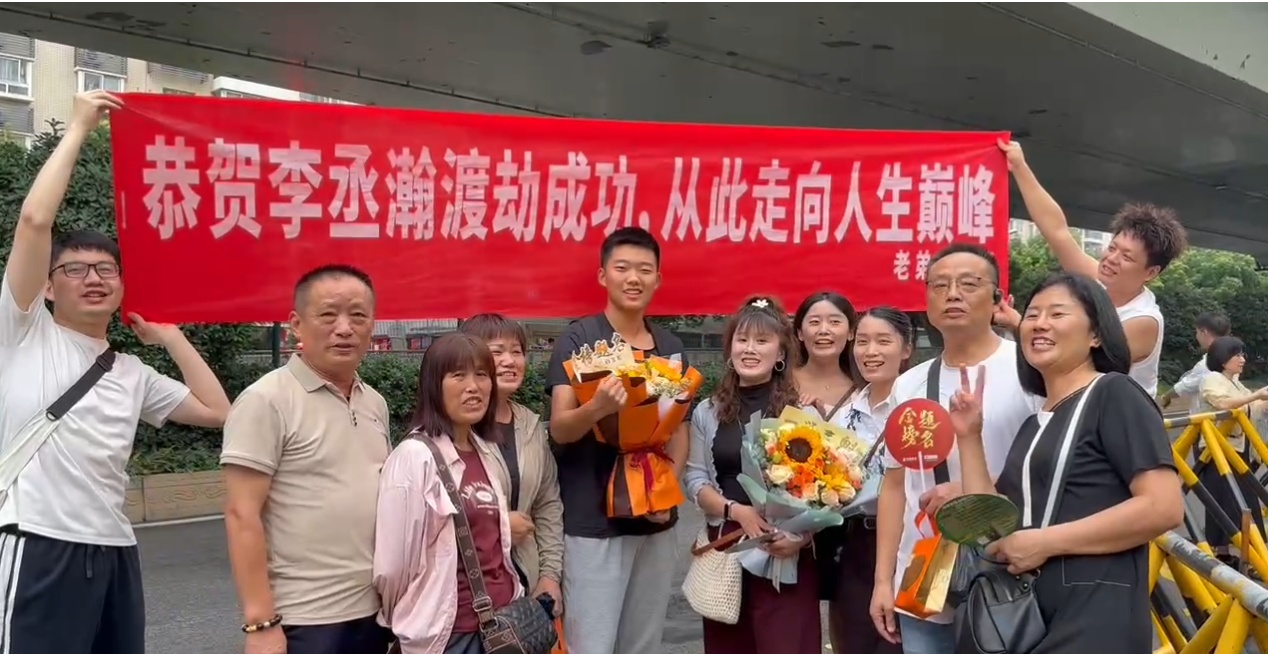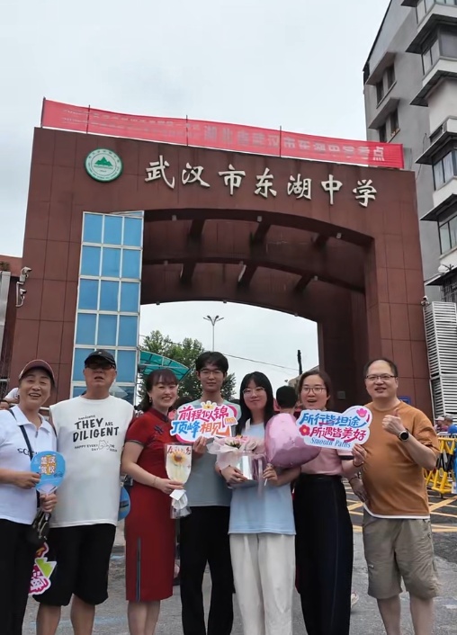 6月9日,武汉市关山中学考点外,考生李丞瀚的10位家人组成强大的亲友团,用鲜红的横幅、鲜花,隆重庆祝高考顺利告一段落,人生迈向新阶段。(湖北日报全媒记者田佩雯)