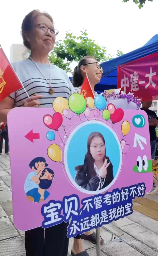 考场外家长举横幅“宝贝,不管考的好不好,永远都是我的宝”,迎接高考考生。(湖北日报全媒记者 李玉麟 余军 喻煜)