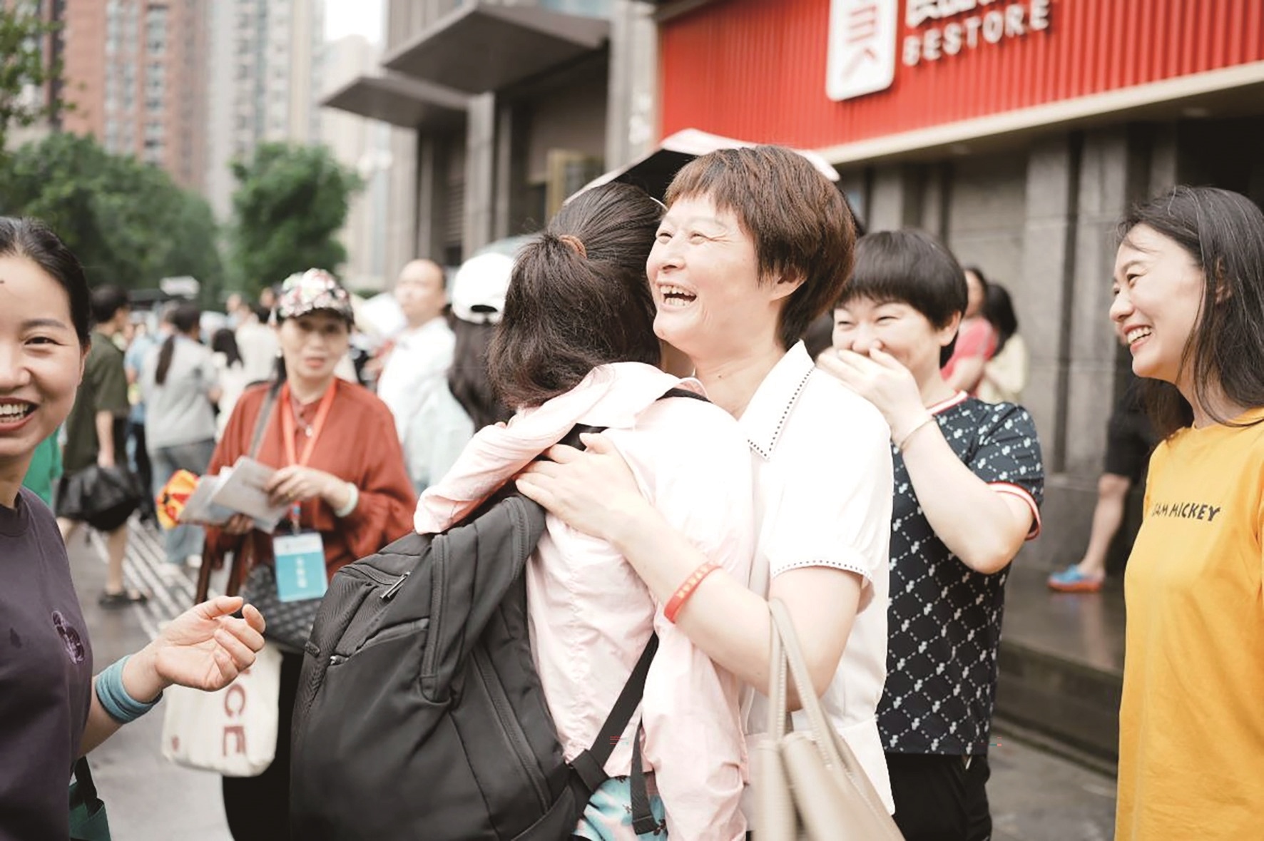“童老师来啦!”“这么大的雨还能见到您太好了!”上午10时35分,考生小枫和小伙伴们冲出考场,与等待多时的童老师紧紧拥抱在一起。“童老师是一个非常负责任的老师,能在初中遇到这样一位班主任,我觉得特别幸运。没有童老师,我可能都去不了高中,我真的非常感谢她。”一名考生激动地说。
