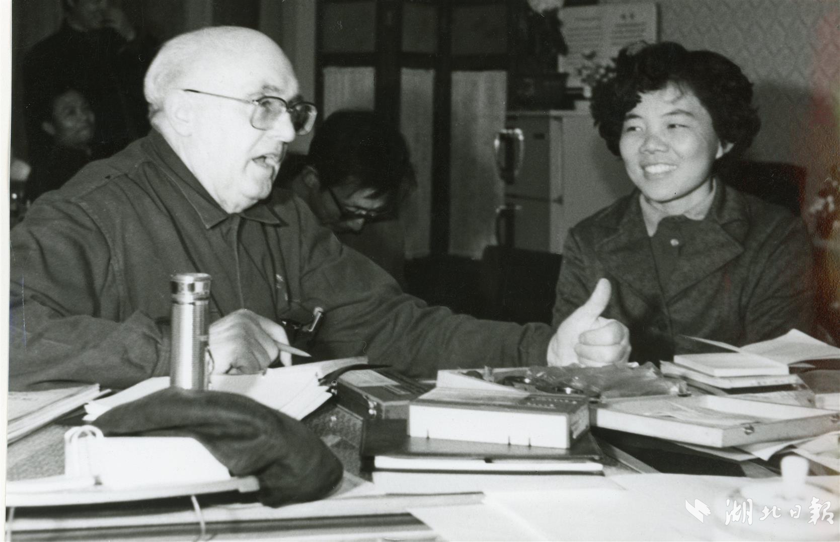 相册里,有一张照片,画面是格里希正向一位女士竖起大拇指。这位女士是原武汉柴油机厂质量检验科科长曹小麓。照片记录的是格里希为质检科挑人,面试曹小麓时的场景。
