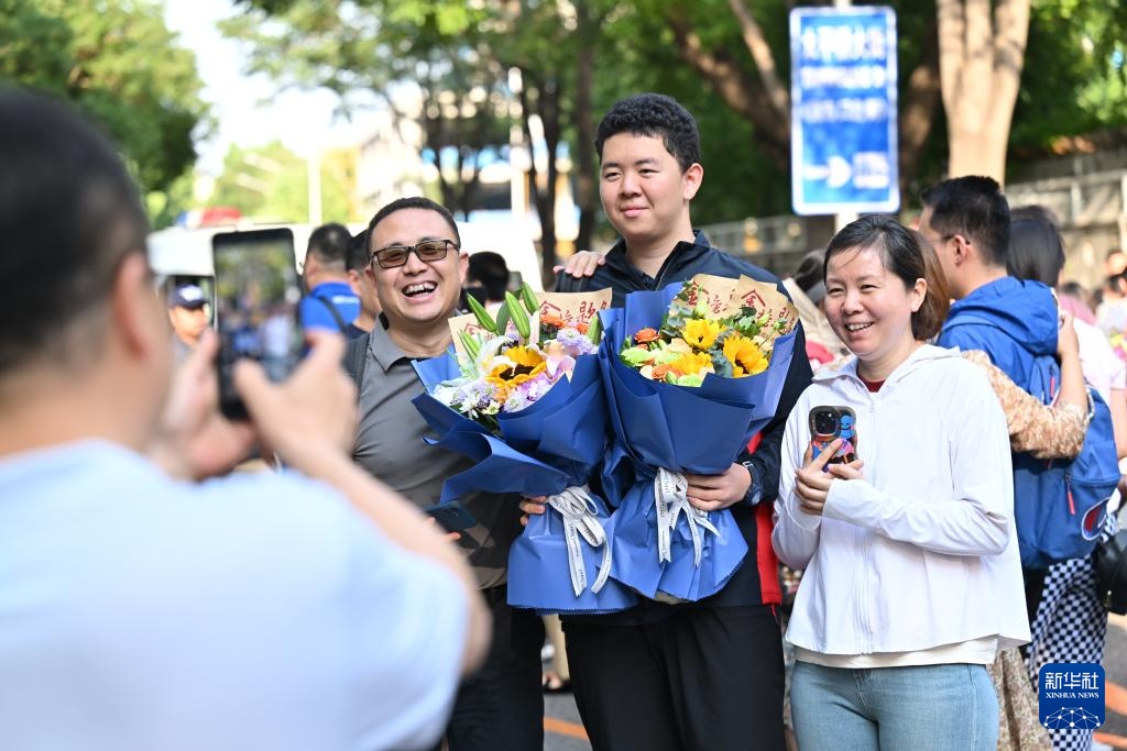 6月10日,在北京市第八中学考点外,一名考生手捧鲜花和父母合影。