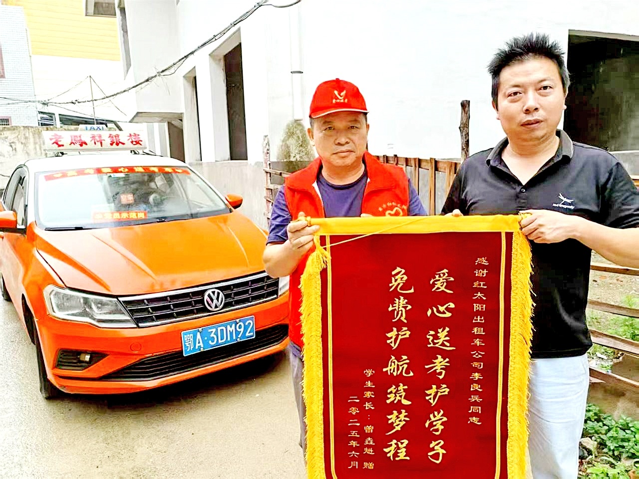 “李师傅提供的一对一接送服务,方便我们孩子的考试出行,感谢司机师傅的辛苦接送。”6月10日上午,市民曾垚魁将一面印着“爱心送考护学子 免费护航筑梦程”的锦旗送到新洲红太阳小汽车客运服务有限责任公司,以表示他们对驾驶员李良兵高考三天来优质准时、无微不至送考的感激之情。