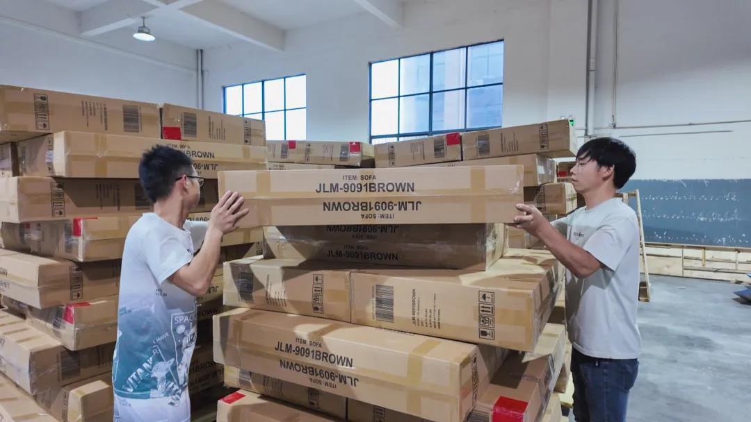 包装生产线上,设备正全速运转,工人们争分夺秒赶制生产任务,保障订单交付。在这里,一件件成品沙发依次经过严格消毒、真空压缩处理,随后被迅速打包装箱,这些整装待发的“包裹”,即将运往海外市场。