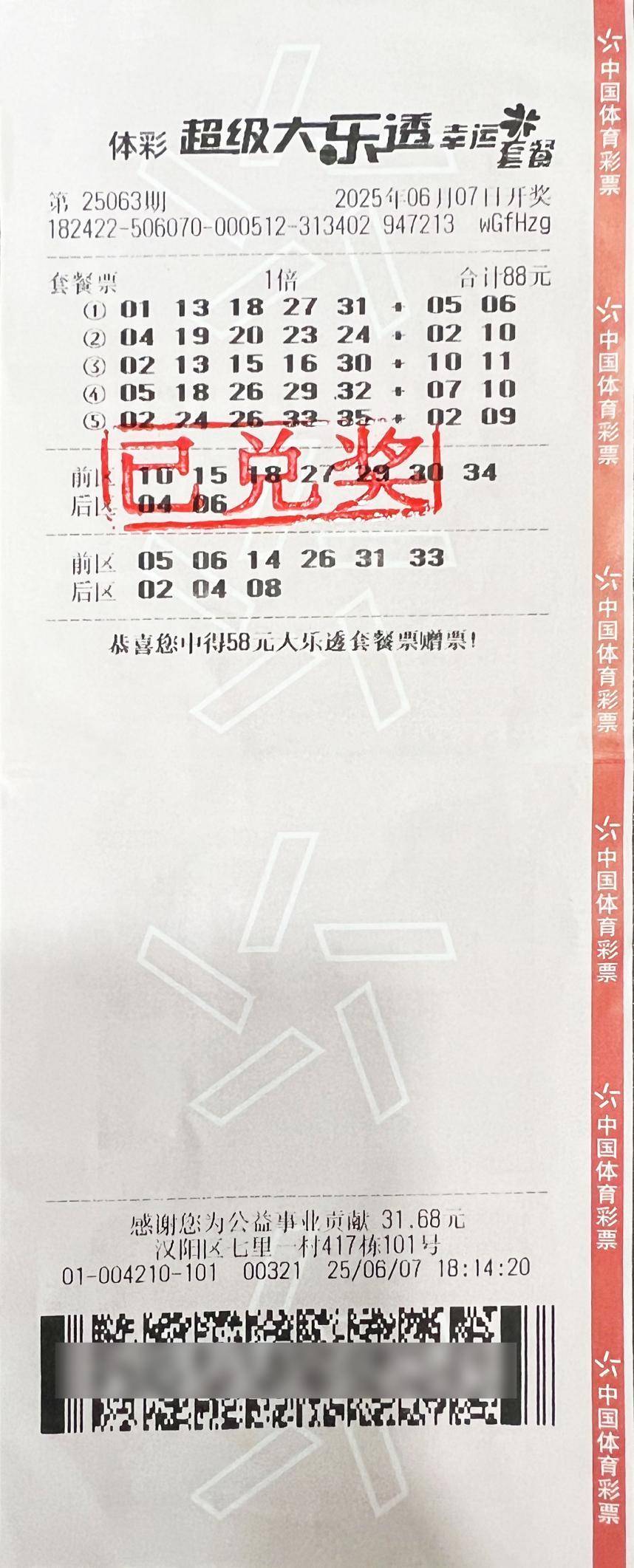 因为套餐票简单便捷,一票还能体验多种投注方式,胡先生自套餐票上市以来就十分钟意。恰逢最近湖北体彩推出的“巳巳如意·乐透有礼”赠票1500万活动,购买指定套餐票就有机会获得相应赠票。胡先生觉得这个活动非常值得参与,不仅赠票中奖率高,还能额外获得中千万大奖的机会。自活动开始以来,胡先生就坚持每期机选88元的套餐票。这次除了中得大乐透一等奖782万元外,随机获赠的58元套餐票也收获了一百多元的奖金。