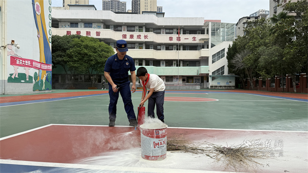 操场演练现场,社区居委会工作人员向学生发放图文并茂的安全手册。徐东路消防救援站的消防员刘志辉结合校园实际情况,通过趣味问答、案例讲解等方式,向师生普及火灾预防、逃生自救等知识,并手把手指导学生使用灭火器。