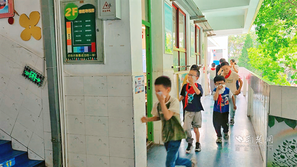 随着总指挥一声令下,工作人员点燃模拟烟雾,校园内警报声骤然响起,各班级教师立即启动应急预案。在社区工作人员与教师的共同引导下,学生们用湿毛巾捂住口鼻,按照既定疏散路线有序撤离。社区志愿者提前在楼梯拐角、走廊等重点区域值守,确保疏散过程安全有序。全校388名师生仅用3分钟便全部疏散至安全区域,充分展现了高效的应急反应能力。