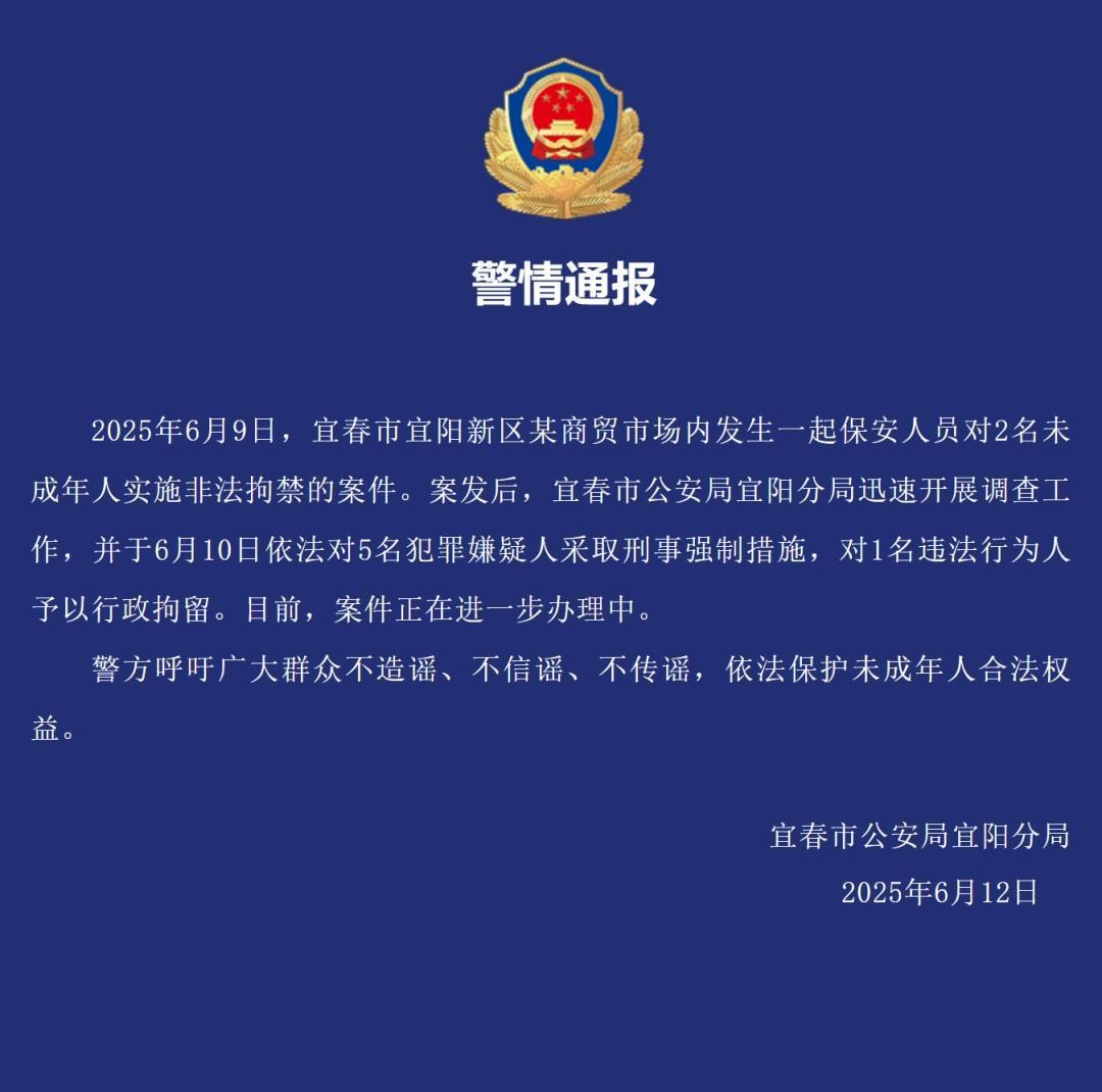 6月12日,江西省宜春市公安局宜阳分局发布警情通报称:2025年6月9日,宜春市宜阳新区某商贸市场内发生一起保安人员对2名未成年人实施非法拘禁的案件。案发后,宜春市公安局宜阳分局迅速开展调查工作,并于6月10日依法对5名犯罪嫌疑人采取刑事强制措施,对1名违法行为人予以行政拘留。目前,案件正在进一步办理中。(据6月13日光明网)