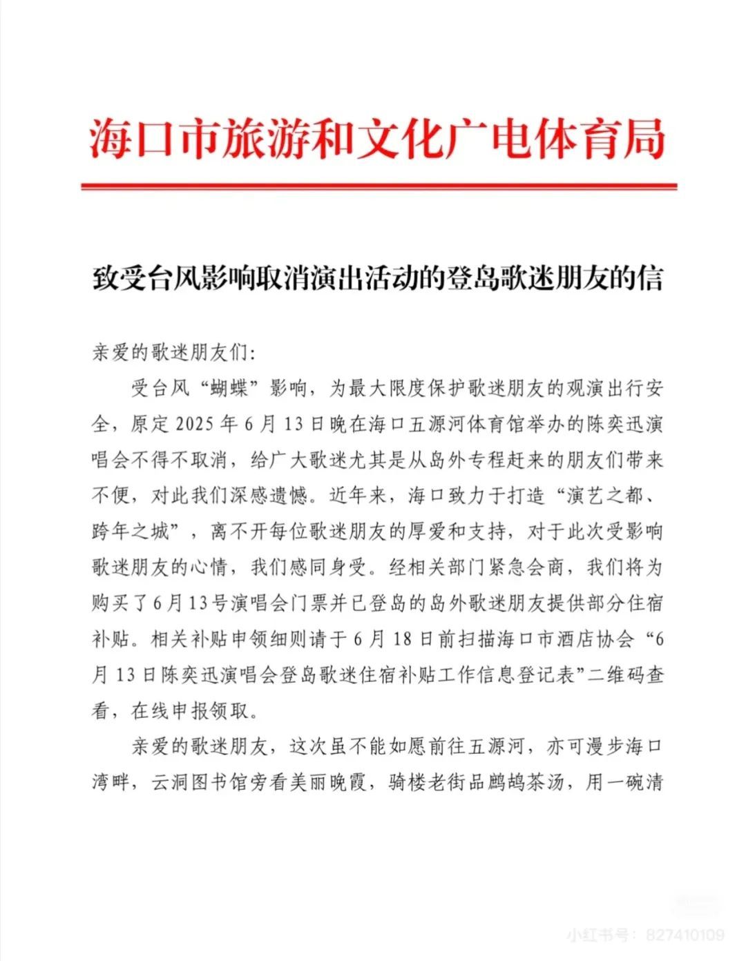 今日(13日)16时许,海口市旅文局发布“致受台风影响取消演出活动的登岛歌迷朋友的信”,表示将为受此次陈奕迅演唱会取消影响的已登岛的岛外歌迷朋友提供部分住宿补贴。