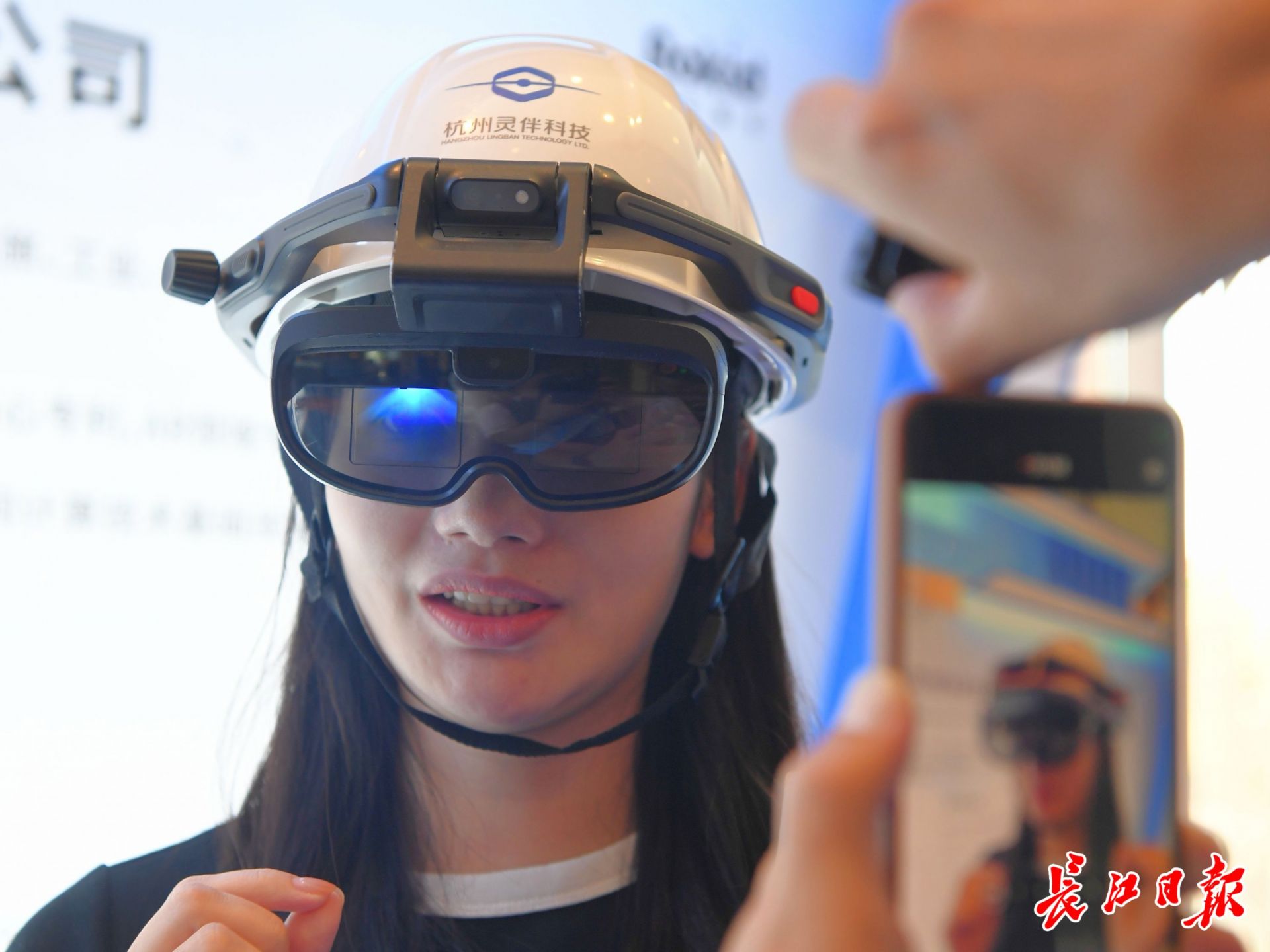 杭州灵伴科技展示的AR5G工业AR智能头环,用于工业巡检、数据交互、远程协作、AI识别等领域。记者高勇 摄