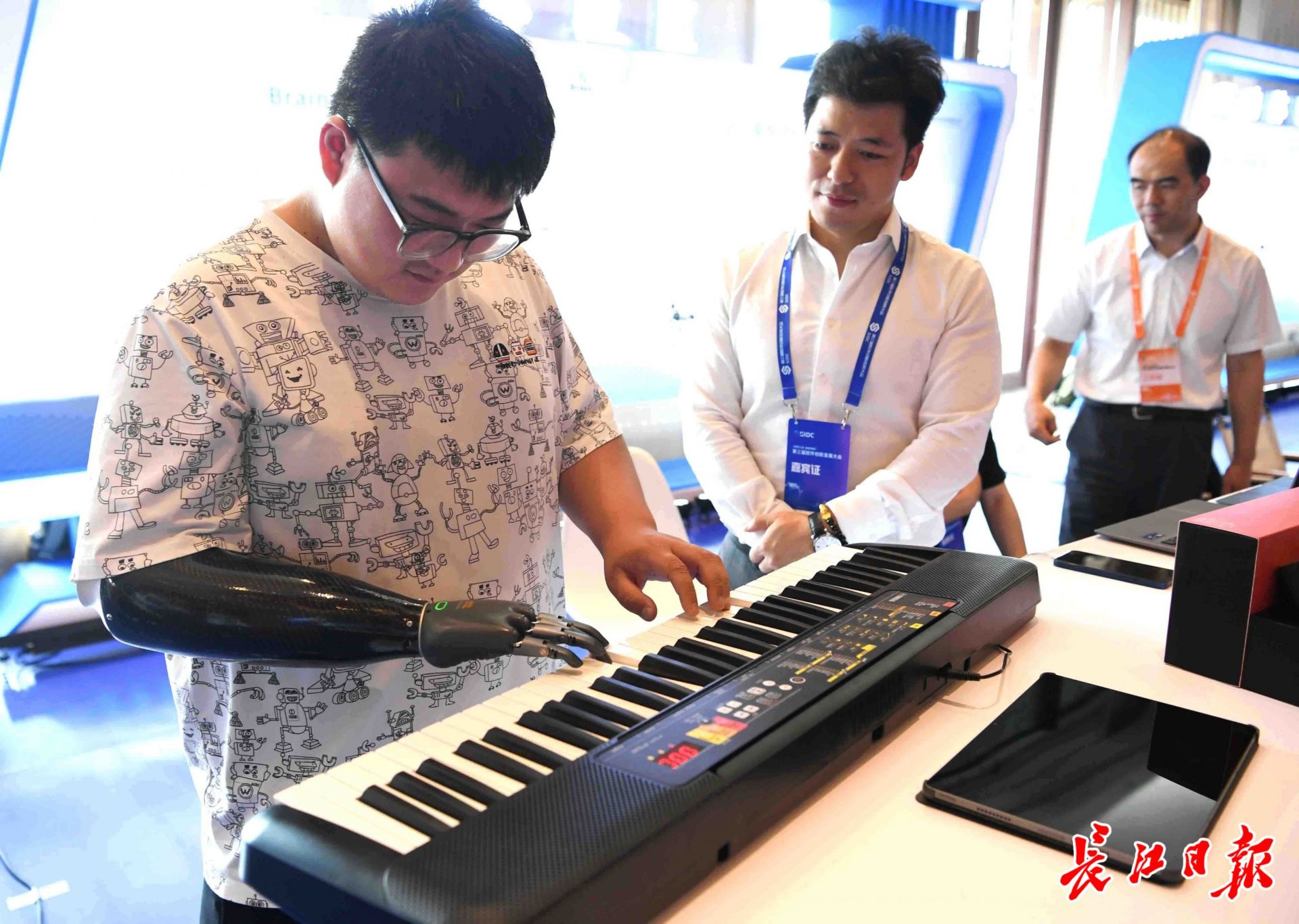 BrainCo强脑科技展示的智能仿生手弹奏电子琴。记者高勇 摄
