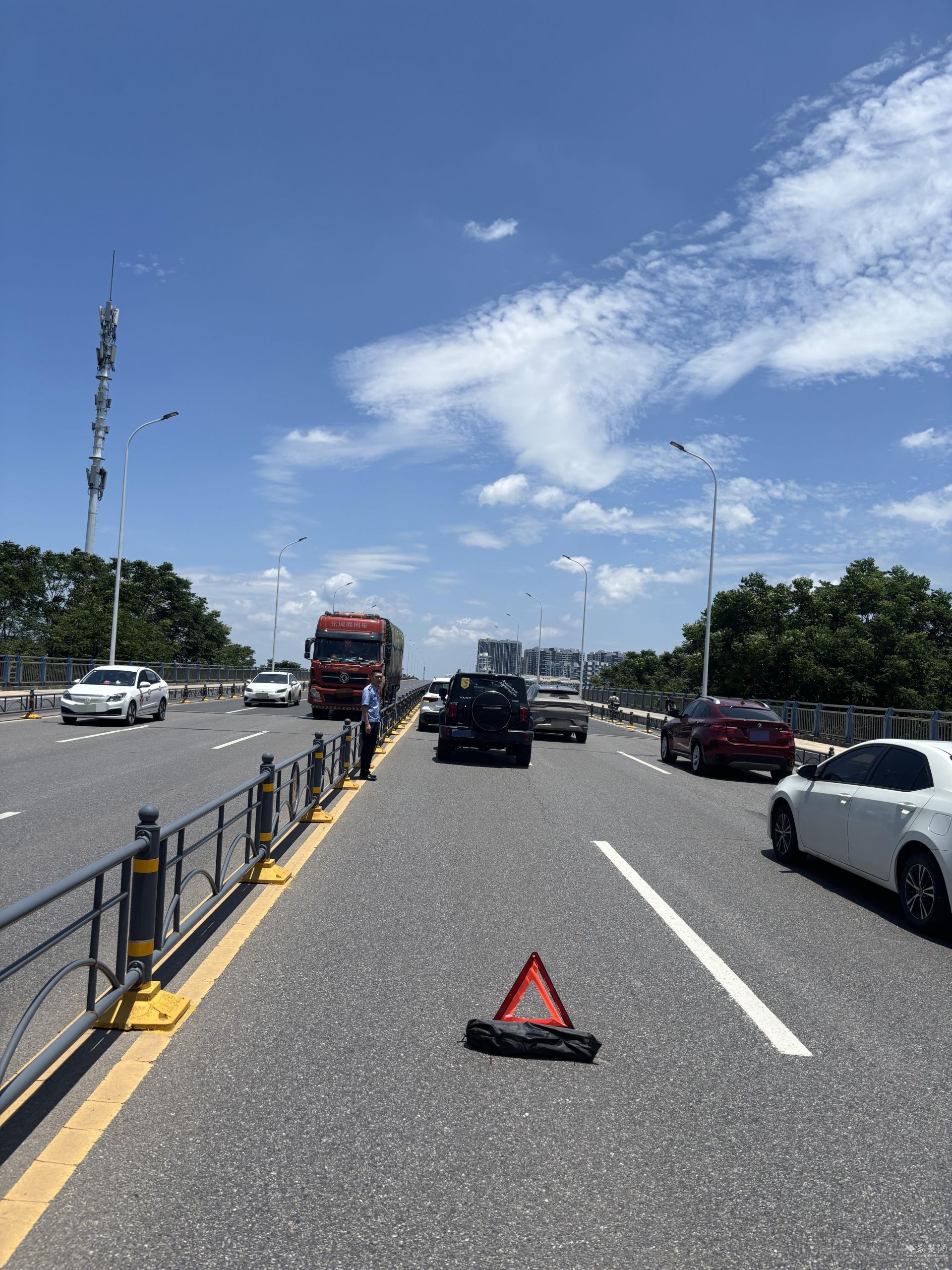 得知情况后,为防止后方车辆因视线受阻引发追尾碰撞等事故,陈吉与常乐第一时间在故障车辆后方规范放置三角警示架,为后方来车亮起醒目的“安全信号灯”,并坚守在烈日炙烤的路面,有序指挥疏导交通。