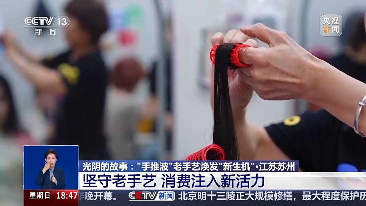 一把梳,一卷筒,指尖翻飞间,流淌的是老手艺述说的光阴故事。“手推波”在发丝间的拿捏与力道,凝结着手艺人的温度与坚持。小桥流水、粉墙黛瓦,在这座以园林艺术闻名的城市里,复古审美在当代文旅体验中破圈而出,手工推卷的波浪,光泽柔美,流淌和闪烁的正是时光和匠心。