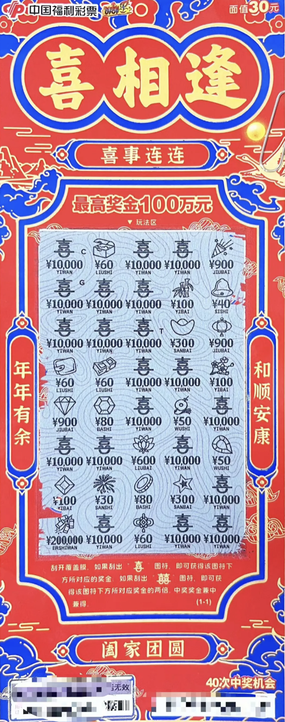 “这么容易,就中出了一万块?”继续往后刮彩发现,这张彩票简直绝了,仅第一行,就出现3个“喜”字,奖金已达3万元。