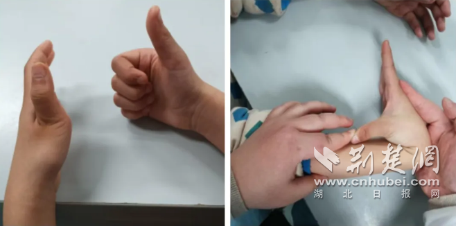 花花的手指出现鹅颈畸形(右)。 通讯员 供图