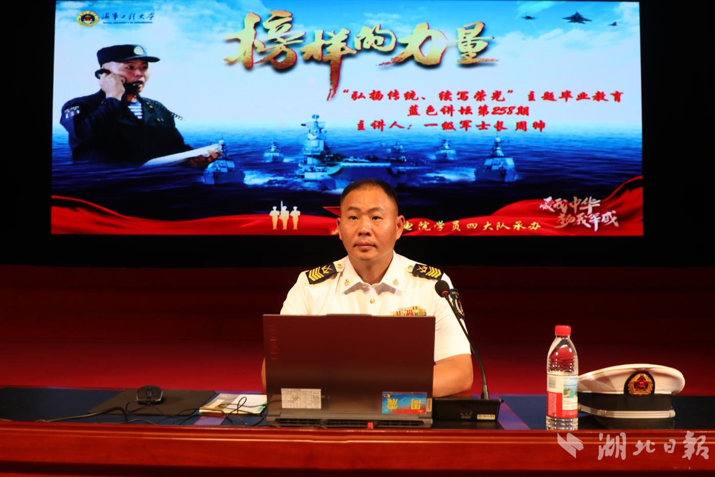 湖北日报讯(记者汤炜玮、杨文漪、通讯员潘麓宇、张世伟)近日,蓝色讲坛第258期,邀请到海军海口舰一级军士长周帅走进海工大,以“火热军营助我成长成才”为主题,为师生及水兵带来一堂沉浸式军旅课。